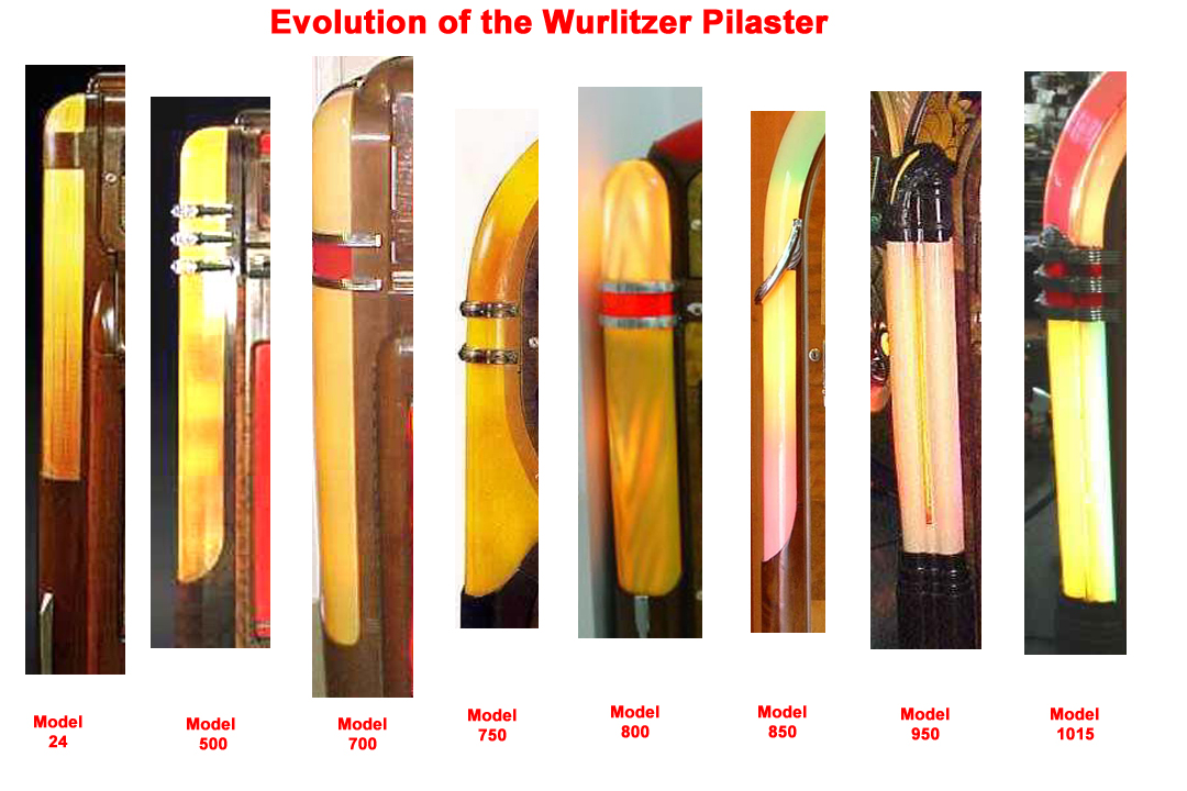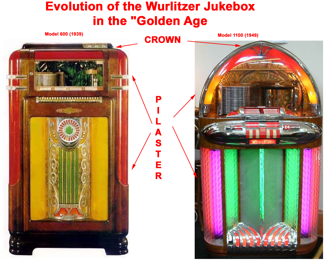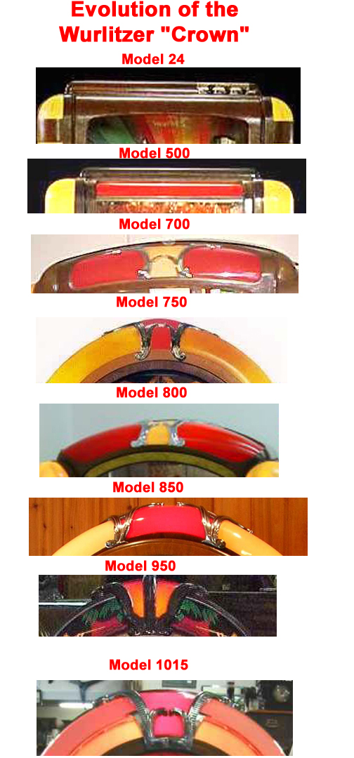Evolution of the Crown and Pilaster in Wurlitzer Jukebox Models Click to Enlarge The pictures above show the evolutionary steps between the Model 600 and the Model 1100. Note that they are gradual in character and retain many of the same elements. The Crown of the jukeboxes has a device in the center that resembles a keystone of an arch. Success of a feature led to its enhancement. The Model 800 has outsized pilasters that look like pontoons. The Model 750 initiated the Arch design, but the window was out of proportion, giving the machine an unbalanced look. In the Model 1080 Wurlitzer attempted to create a "conservative" design for places that did not fancy Art Deco -- but they used the same basic "arch" framework. During World War II, most jukebox manufacturing was shut down and the various companies made precision instruments for the Armed Services.