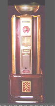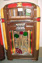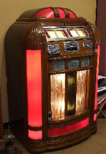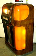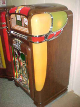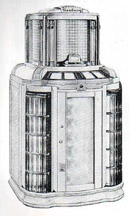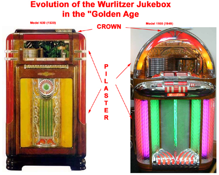 It would be a serious mistake to underestimate the importance of the package that encloses the jukebox. In essence, the last thing that the company does is the first thing that the public sees. The fact that the vast majority of you have skipped over the mechanics section is proof positive that the aesthetic design of the jukebox is the key to its success. The public did not care about the elegance or reliability of the machinery inside the box -- they wanted to invest their hard-earned Depression-era nickel in an elegant fantasy. Manufacturers knew that the customer must be attracted to the machine, so it must stand out. The customer must be able to clearly see his musical options and easily choose them. The customer must receive some visual reward in addition to his chosen songs -- the music must emanate from something rather than a ghostly presence in thin air. Finally, the customer must believe that by playing the machine he is part of a positive, sophisticated, well-thought of group. You'll also recall the plastics, bright colors, bubble tubes, chrome and the like were idolized in the 1930s as part of a much better "future," the present being so very dreary. It is only when the giddy display became commonplace (and the times like the 1950s more conservative) that jukeboxes began to be considered gaudy and vulgar. Finally, manufacturers had to tread a thin line between the cost of the sophisticated adornment and the likely revenue from the machine -- the absolute maximum possible revenue from the machine was about $1.00 per hour (that is, about 20 three-minute plays at a nickel each). However, if you haven't read the section on mechanical cabinet requirements, you will miss the constraints of the mechanism on the shape of the jukebox. Thus, the aesthetics of coin-operated phonographs are a compromise between vision, mechanics, and economics. The general tone of American Society in the Swing Era was that: (a) Things couldn't be much worse than the Great Depression; and(b) Science is going to provide a wonderful future for everyone. The former is probably true, but the latter has been marked with mixed success. However, Faith in the Future, (stimulated by the 1933 Columbian Exposition and the 1939 World's Fair) created an intense popular interest in new styles and new materials. The Depression was pretty dull -- the public began to reject Puritan plain and came to like things that were new and bright. However, flashy light-up jukeboxes did not spring out of thin air (or the World's Fair) -- they evolved gradually through the orderly business process of introducing new designs to the market. The Jukebox of the 1930s had a regular life cycle. A new "Top Box" was placed in a high value environment, and gradually was sent down the value chain until it was salvaged. The various companies had a fairly large investment in mechanicals - the patents, production machinery and service training -- so they were reluctant to introduce radical changes in the underlying "hardware." Following the lead of the auto industry, jukebox manufacturers devoted most of their model changes to the exterior. While the appearance changed every year, the mechanicals changed very gradually -- in 1947, Wurlitzer jukeboxes were using a changer mechanism that was quite similar to that in 1930, the models differing only in terms of refinements that would increase revenue: more selections that were easier to make. As we have seen, AMI and Seeburg tried to compete on the basis of sound quality, but made only limited intrusion into Wurlitzer's market. Seeburg only took off when it offered a 100 (and then 200) selection machine. One consequence of the relatively unchanging internal mechanism were limits on the size and shape of the exterior. During the period 1930-1950, Wurlitzer machines "evolved" slowly from the "Box" to the "Arch" shape that has become iconic. All of the machines were designed by one man, Paul Fuller. The photo below shows the beginning and the end of the evolutionary process. In general, the year-to-year changes revolved around the vertical elements (the Pilasters) and the changer display in the "Crown". The early model lets you look at the changer through a window. The final model has a clear plastic nose cone that reminded many of the bombardier's compartment on a B-29. Beginning and End of Evolution of the Wurlitzer Jukebox in the Golden Age From box to arch... Model 600 and Model 1100 pictured Click to Enlarge Between this "beginning" and "end" stage, there were a number of variants.