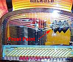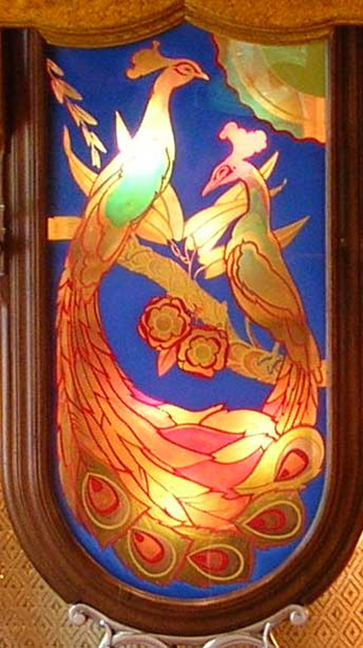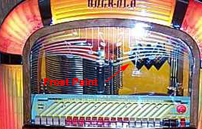Wurlitzer Model 850 Jukebox Lit and Unlit, Detail of Peacocks Details of Changer Click to Enlarge The Wurlitzer Model 950The Model 950 is another beautiful object whose life was cut short by the War -- only 3,400 were made. This was the first jukebox to use fluorescent tubes and the first to use long tubes filled with methylene chloride, a liquid with a low boiling point. When the lights were turned on, bubbles would form and circulate througout the tube. These devices came to be known as "bubblers" or "bubble tubes". Internal mirrors made the gazelles on the box's face change colors as the same colors changed in the pilasters.