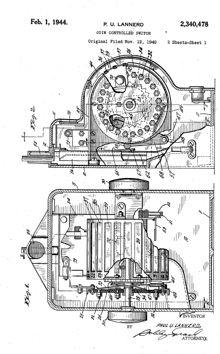 The Collison/Lannerd Selector, Unique to the Packard Series Collison Jukebox Selector Cabinet D-124,440 Lannerd Jukebox selector Control Mechanism, Patent No. 2,340,478 Collison Lanard Selector on Packard Manhattan (left) and Pla-Mor (right) Jukeboxes Click to Enlarge Click here if you want to learn how to get Patent Drawings Capehart left Wurlitzer in the mid 1940s and resumed producing jukeboxes under the Packard name. He was forced to use a new Collison/Lannerd 24 disc selector, since Wurlitzer held the patent on the Simplex. This mechanism produced an ugly "bump" on the crown and may have put customers off. Capehart was a U.S. Senator at the time these models were being produced. The Packard "Manhattan"This was Packard's "Upscale" model for 1956. The unusual "headpiece" contains the new Collison/Lannerd changer that was operated by rotating the red plastic dial. The cabinet was made of fine woods, and the frosting on the window is real etching. The mechanism was chromed and the lighted panels are glass.