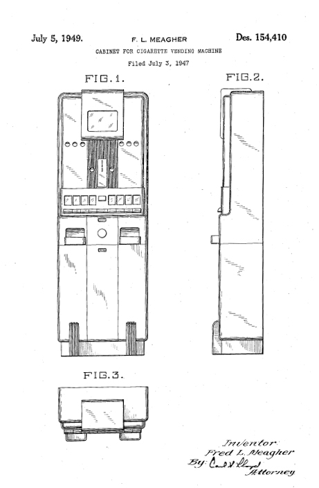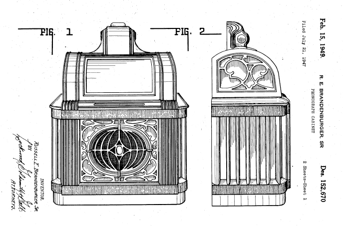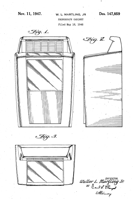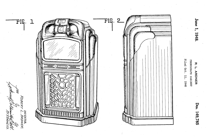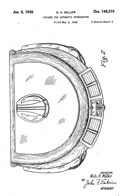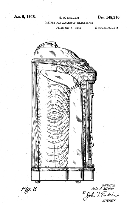 Design Patent Diagrams for the Seeburg Model S-148 Symphonola Design Patent D-148,316, Drawings 1-3