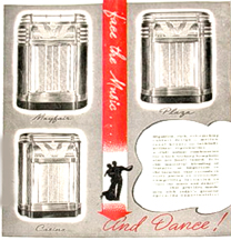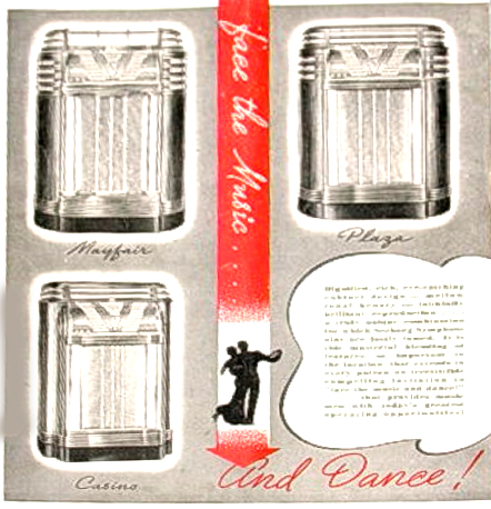 ![]() Advertisements for the Seeburg "Casino" Line "Free the music and Dance..." One makes a full house... The "Casino" was the top of the line with the most embellishment, followed by the "Mayfair" and the "Plaza." The Seeburg "Classic", "Vogue"This is basically the same box as all the others (above). This version is reminiscent of the Wurlitzer 500-600 series as well as the Rockola Luxury Light-up. This styling is adapting to trends, rather than setting them. The "Vogue" was offered in "Marbl-Glo:"