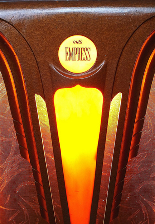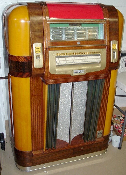 Dave's Empress No violet... Click to Enlarge It appears that the "Empress" was the model for the jukebox shown in this 1946 Disney cartoon called "All the Cats Join In" featuring Benny Goodman. Apparently, back in 1946, the Wurlitzer 1015 had not yet achieved iconic status. The Mills "Throne of Music"Although the name of the jukebox is a bit preposterous, this was the down-scale version of the "Empress" It has the same basic frame, selector and changer without the detailed and expensive metal facing.