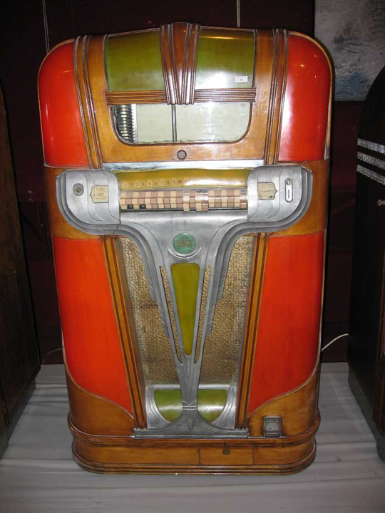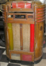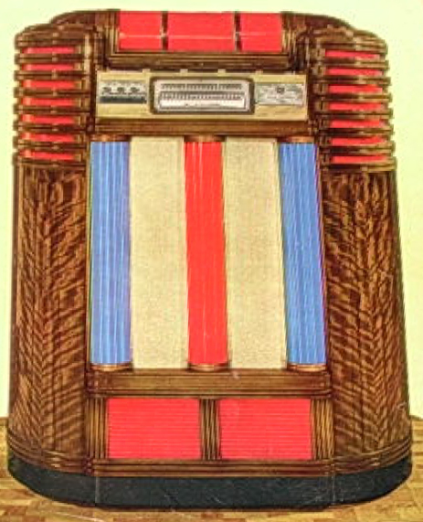 Jukeboxes by the Automatic Music Instrument Company (AMI)AMI began in 1909 as the National Automatic Music Co, making automatic player pianos. Having designed a mechanism which allowed music rolls to be selected, this was adapted for use in phonographs, the first of which was produced in 1927. The mechanism used was the first that could play both sides of 10 records, allowing 20 selections. Aside from modifications to extend the number of selections, this mechanism was used for the next 30 years. The company was renamed to the Automatic Musical Instrument Company (AMI) after World War 2. The Automatic Canteen Company bought AMI in 1962, merging it with its subsidiary ROWE AC Services, a manufacturer of coin operated vending machines. Rowe-AMI is still manufacturing jukeboxes today. The AMI "Streamliner"The Streamliner was manufactured between 1938 and 1939. Of note is the center bar of the speakers. AMI introduced an elongated incandescent bulb called the "Lumiline" to provide illumination that did not appear to emanate from a point source. Late, fluorescent tubes were used for that purpose.