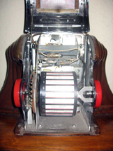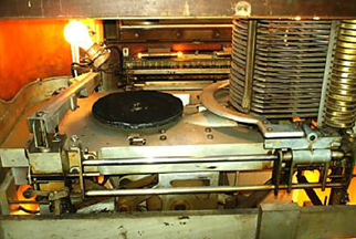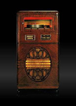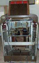 Mills "Throne of Music" Interior Changer Mechanism and Audio Components Click to Enlarge Both the "Throne" and the "Empress" had a modest popularity. The Packard CompanyThis was NOT the company that made fine automobiles, but the creation of Homer Capehart, reputed by some to be the "father of the jukebox industry". During the 1920s, he had very mixed success in the coin operated phonograph business. In 1932 Capehart formed Packard and developed the Simplex mechanism for automatic record changing. He sold the device to Wurlitzer and , as Operations Manager, moved Wurlitzer to the forefront of the jukebox business. After becoming a millionaire, he was elected to the United States Senate as an ultra-conservative Republican, a crony of Joe McCarthy. When you think of those carefree 1950s epitomized by the Model 1015, there is also the underlying reality of the Witch Hunts and bigotry -- For better or worse, Capehart gave us both.