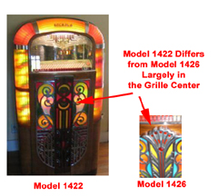 The Rock-Ola "Commando" and "Premier" Design Patent D-131,483 Rockola also offered a model with an upward-firing speaker called "The Premier" (Far right) Click here if you want to learn how to get Patent Drawings A version with a Spectravox-like bowl on top was offered as the "Premier" The Rock-Ola Model 1422 "Magic-Glo"Beginning in 1946, Rock-Ola introduced several machines featuring the "arch" design that had become a jukebox icon. The series began with Model 1422, although the series uses identical technology, differing only in decor. The Model 1422 is quite conservative and appears to take a cue from the Wurlitzer 850. This model had color cylinders in both the grille and the pilasters. The crown was illuminated by a fluorescent bulb and the shoulders by incandescents. This was the first Rockola Model that allowed the customer to see the mechanism. An 18th century pastoral scene was painted on the walls of the chamber that held the changer. The Rock-Ola Model 1422 and 1426 are Qute Similar