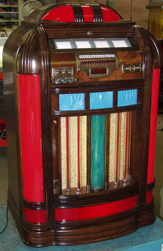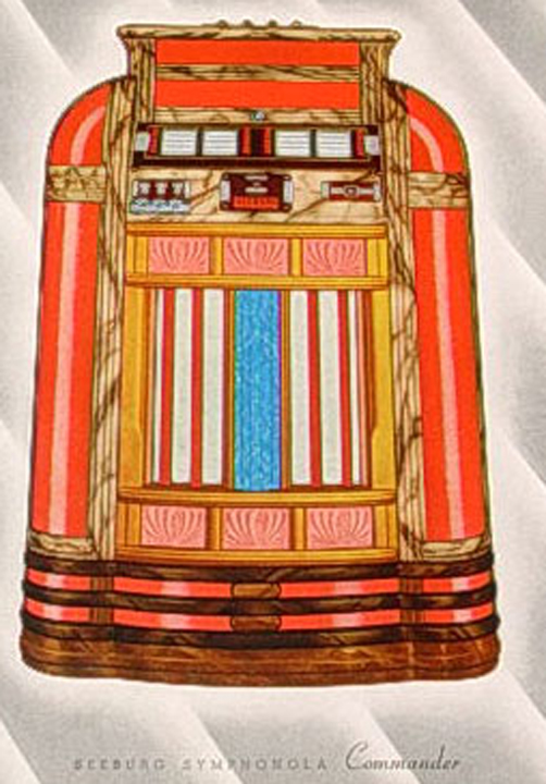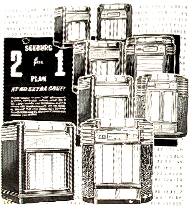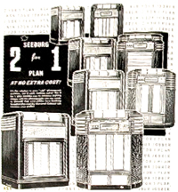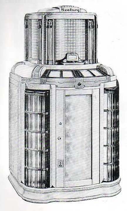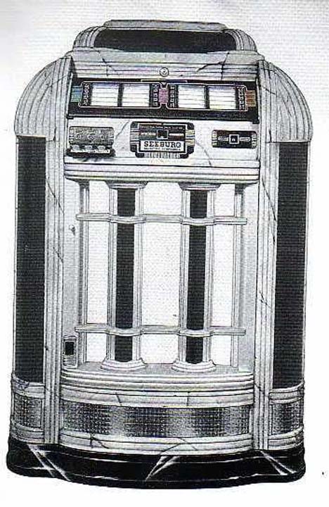 The AMI Model D AMI Model D-40, 78 rpm record variant, shown in "demitasse mahogany" AMI Model D-80, 45 rpm record variant, shown in "beechwood bisque" Click here if you want to learn how to get Patent Drawings Here is a video of the AMI D-80 in action, playing "Over the Rainbow" by Judy Garland. This is a video of the AMI D-40 playing a 45 rpm recording of Chuck Berry doing "School Days" -- note that the 45's are encased in a sleeve (or sabot) to be held by the carriers that are still the diameter of a 78 rpm record. The Seeburg CorporationThis company, created by Justus P. Seeburg before the turn of the century eventually came to dominate the jukebox field in the late 1950s. The Seeburg company was aggressive and innovative, especially in the area of sound quality and remote-operated wall selectors. They made attractive machines that sold respectably. The breakthrough came when Seeburg introduced the Model 100 which offered one hundred selections. The Seeburg "Concert Grand, "Crown", "Regal", "Gem","Universal"This was the 1937-1938 line of Seeburg jukeboxes -- their internal mechanisms were basically similar. There were three slightly different designs. The "Concert Grand" was the top of the line and the "Gem" was the bargain basement. From the ad (below) it looks like Seeburg had a "2-for-1" jukebox sale.
