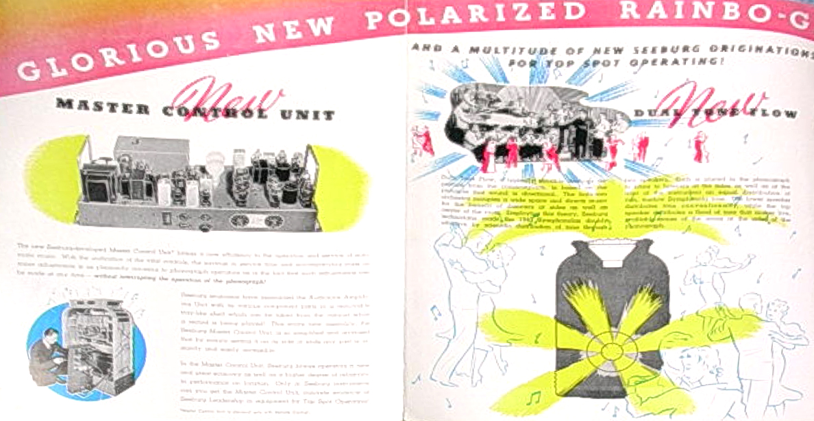 The Seeburg "Concertmaster" Patent No.2,526,788 Note that the brochure suggests that this machine is for a "Top Spot" Click to Enlarge Click here if you want to learn how to get Patent Drawings The Seeburg 9800 "Hi-Tone"During the 1940s, Seeburg, Rock-Ola and AMI experimented with "High Fidelity" sound. Seeburg gradually adapted its novel (round) model 7800 ("The Barrel") in several cycles to achive the "Hi-Tone Deluxe" Model 9800.