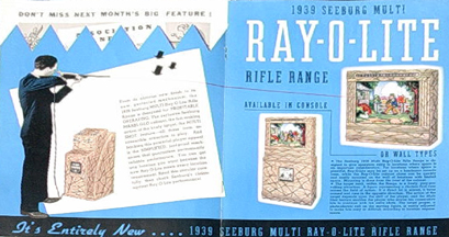 The Seeburg "Vogue" All covered by Patent No. 2,191,729 "Marbl Glo" faux finish described in the Seeburg house magazine, April 1939 Click to Enlarge Click to Enlarge Click here if you want to learn how to get Patent Drawings On a side note, the 1939 touting of "Marbl-Glo" as an upscale, refined finish was somewhat shattered by the introduction of the "Ray-O-Lite" electronic rifle range: The "Ray-O-Lite" Target Game Click to Enlarge Apparently the soft marble glo set this thing apart from other amusement park gadgets. Last year's upscale is today's downscale. The Seeburg Symphonola "Colonel", "Standard", "Major", "Envoy", etc.The "Colonel" got its military title because it was the first of Seeburg's box units to be fitted with circuitry to enable remote wall units to make selections as well as the keyboard on the box. "All Electric" selection was an advertising theme for 1940. Other notable features included a "credit wheel" that kept the customer appraised of how many selections were remaining to be made. The unusual protruding top held playback equipment -- it was somewhat larger due to the volume of the electrical selection apparatus. This was a fairly massive machine. I, personally, do not like the big bulge on the top.