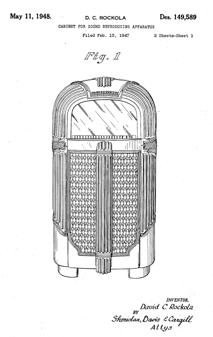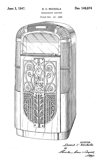 The Rock-Ola Model 1426 Design Patent D-146,874 That's paint instead of etched glass in the window Click here if you want to learn how to get Patent Drawings The glass in the window is not etched -- the "frosting" is painted on -- and bedevils restorers. The Rock-Ola Model 1428 "Magic-Glo"This box uses deeply molded acrylics on the pilasters and arch, reminiscent of the AMI Model A and Model B; it has a keystone, reminiscent of the Wurlitzer jukeboxes. The body of the box was wood but the door was blonde-grained metal. Only one color cylinder was used and it is in the center. Otherwise, this is exactly the same box as the Model 1422 and 1426. It is a lot less conservative.