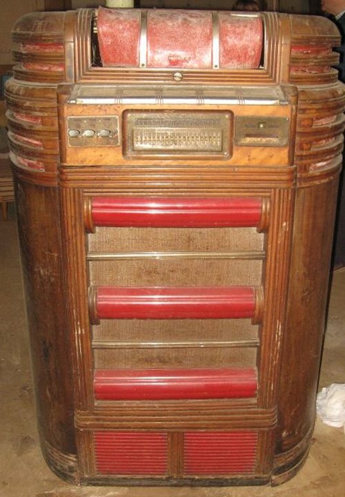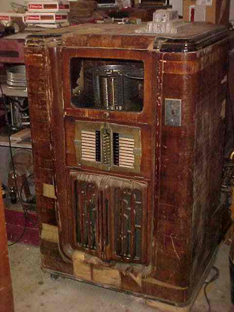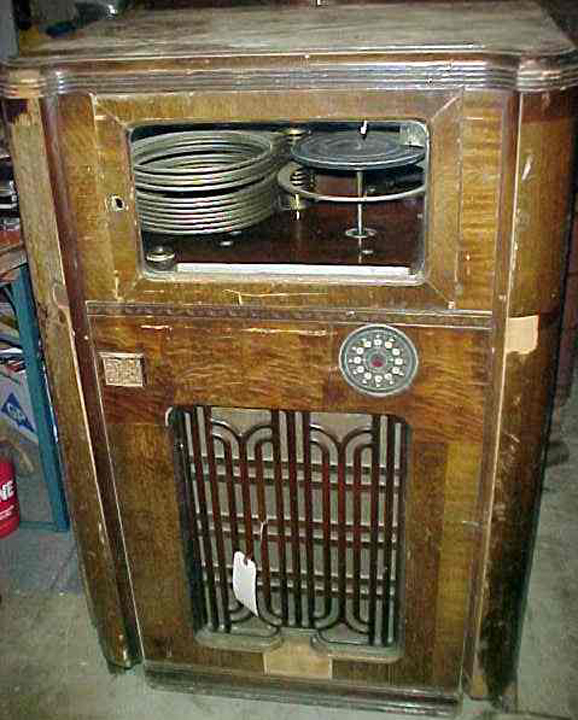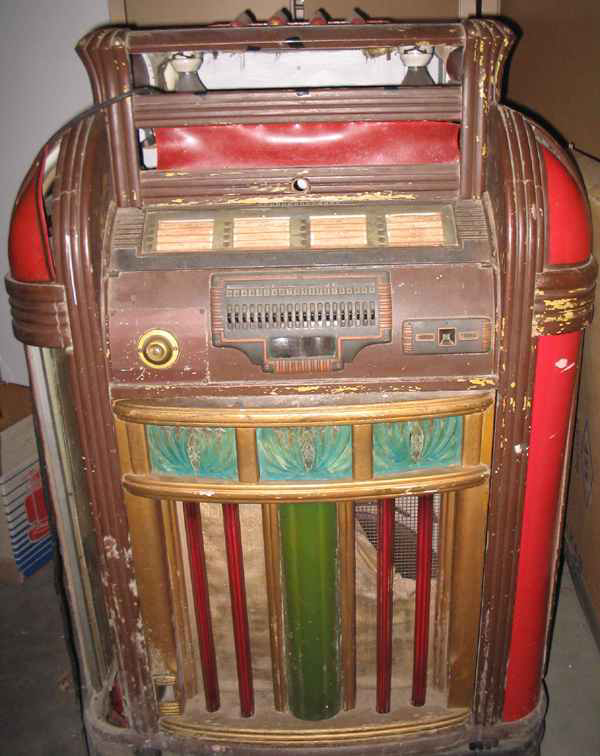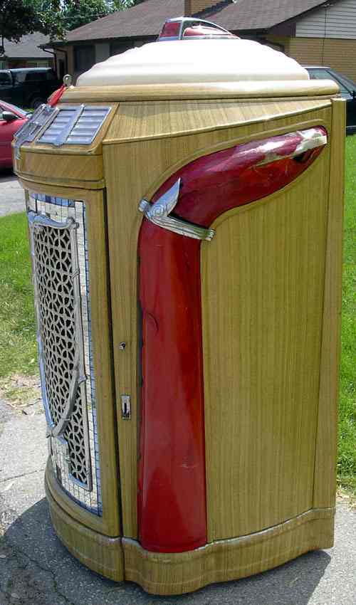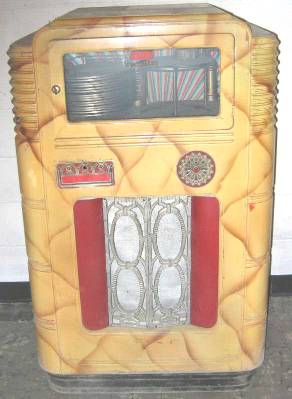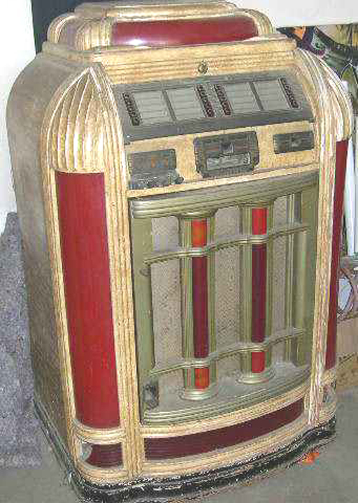 Current condition of the Model 716 Wrong Grille, Horrible Paint Job Click to Enlarge Click here if you want to learn how to get Patent Drawings The Model 716 sold no better than the 616 line. In 1938, they conducted an experiment pitting a wood box (the Model 50 against a plastic light-up juke ( the Model 24). The Wurlitzer Model 50 "Console"The Model 50 represented the aggregate of all the "best" features in a wood jukebox. Apparently designed by a committee, this is the "Modern" without the turquoise pilasters, but retaining the "open mouth" speaker. The veneer work is spectacular. With the exception of the curlicues in the grill, this is right in step with the best French Art Deco furniture of the period. Paul Fuller gets the credit for the Model 50.