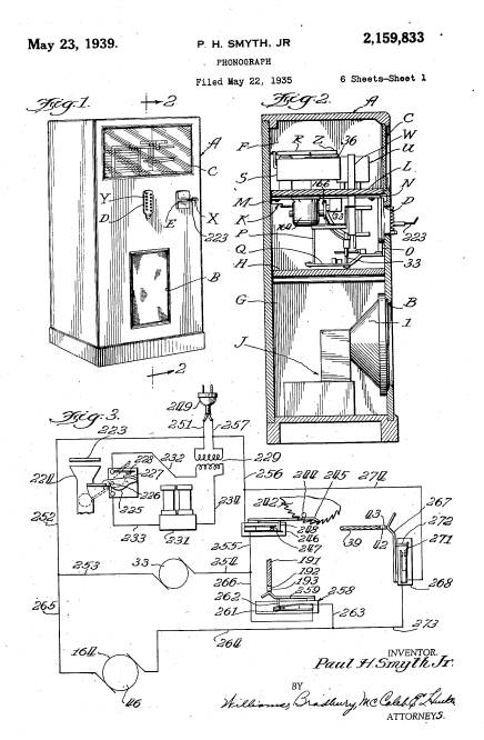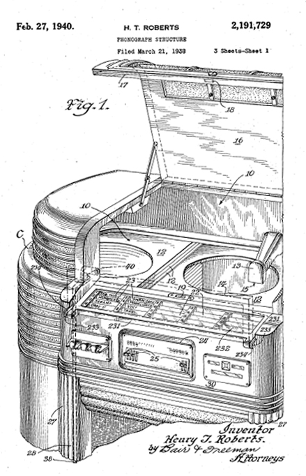 The Rock-Ola Model A Patent No. 2,159,833 Click to Enlarge Click here if you want to learn how to get Patent Drawings The Rock-Ola Model B, "Rhythm King and Imperial"Our reader Andrew provided a clarification about the "Model B". Apparently it began as a snappy 12 disc box called the "Rhythm King" and evolved into a fairly stodgy machine called "The Imperial" -- Andrew writes: "... In the Rock-Ola Model B section you show a patent drawing for the Rock-Ola Rhythm King from 1937. I owned one of those for many years, and the striking grille pattern with the musical notes carved in, plus other little details are tell-tale of that machine. The 'Imperial' was a 24 record machine. The Rhythm King only held 12 records. ..."