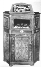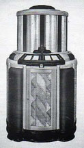 Filben FP-300 Maestro Filben Changer patent No. 2,274,921 Batavia Metal Products Company Click to Enlarge In all likelihood, the Filben is one of the rarest (if not the rarest) of all jukeboxes. William Filben invented a new 30 record changer mechanism and took it to David Rockola who agreed to manufacture and distribute the machine. They were to be made under the name "Filben" so as not to undermine the Rock-Ola brand while the new changer was being tested in the marketplace. The first prototype models were made in September 1938. Unfortunately Filben died, and his heirs decided to leave Rockola and form a new company called the Filben Manufacturing Co.; The Batavia Metal Products company actually produced the machines and they were distributed by the U.S. Challenge Co. of Chicago. [The first cabinets were briefly named Mirro-cle Music, an amalgamation of the two words mirror and miracle.] Production was halted because of the war. In 1947, Maestro was produced for a short period. Apparently, two versions were made, one with red plastics often referred to as the FP-300 and another, even rare one with green plastics was designated FE-300. (You can also see them listed as FP-305 and FE-305.) David Rockola was not thrilled at the possible competition from the Filben, since his boxes only had 20 selections while the Filben had 30. Rockola was able to block production of the Filben after only 896 units had been produced, winning a patent infringement case in August of 1948. The Filben passed into history. The Mills Novelty CompanyThe Mills Novelty company (no longer in business) was once a leading manufacturer of coin operated devices, including slot machines, vending machines, penny scales, and jukeboxes. This company was the manufacturer of the Panoram, a jukebox that showed film clips that have come to be known as "Soundies" -- which give us a glimpse of the best bands and dancers in action. We are planning a separate chaper on the Panoram, look for it. Our extensive patent research has not been able to turn up any designs for the Mills jukeboxes shown below, although they are two of the most attractive ever produced. Our guess is that the two were designed by either Fred Meagher or Willard Martling, who did other work for the Mills company during the late 1930s. We have been able to find some cabinet designs by these men, but they are not the "Empress" or "Throne of Music." These examples are shown below.