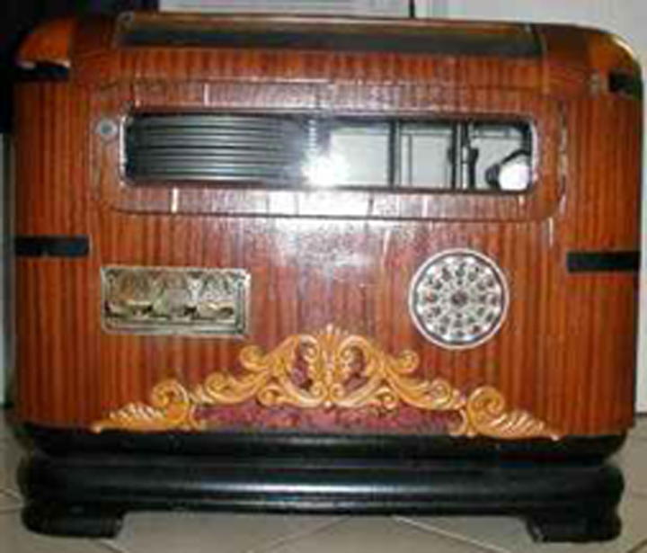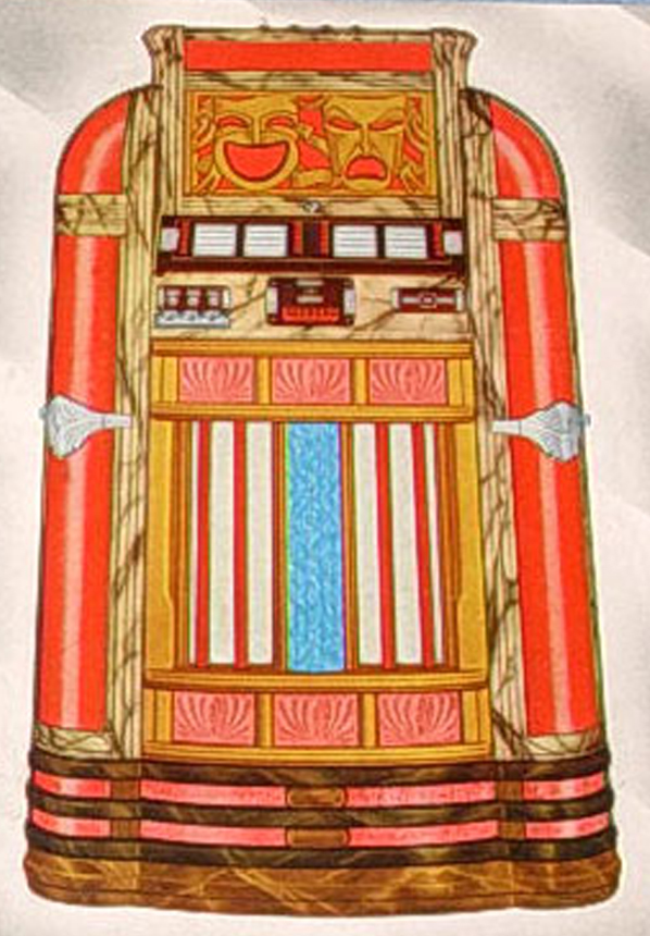The Wurlitzer Model 616 Jukebox, Variant 2 Design Patent D-107,148 Catalog photo and Details of color field in the changer compartment Click to Enlarge Click here if you want to learn how to get Patent Drawings Here is a video of a Wurlitzer Model 616-B jukebox that shows the selection and changer mechanism in action. Both versions of the Model 616 offered 16 selections instead of 12. This tempted the marketplace, but the 616 did not produce the sales results that Wurlitzer desired. Wurlitzer Model 716According to the catalog picture, the Model 716 had a burl walnut finish with painted red pilasters, evocative of the "modern.". The only photo of the 717 that I could find was in deplorable condition and the owner admitted that it has the wrong grille. (It also had an atrocious faux finish.) I've tried to "restore" this photo by using the magic of Photoshop.