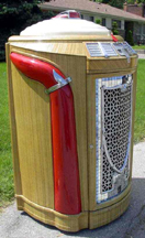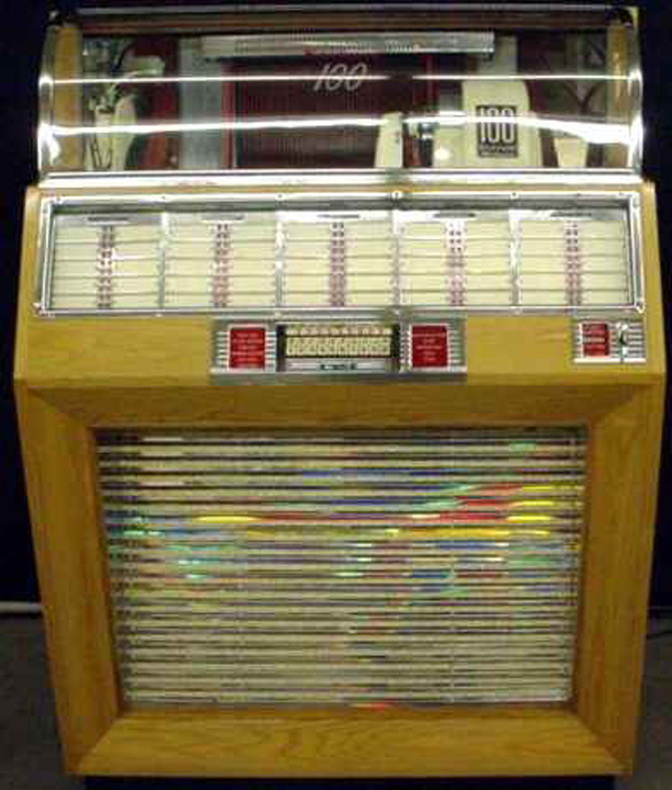 Seeburg Model 148 Click here if you want to learn how to get Patent Drawings Here is a video of a Seebburg "Trashcan" jukebox that opens the lid to show the selection and changer mechanism in action. The song is Little Darlin, performed by The Diamonds. If you look closely, you can see a "Trashcan" (wood model 146) in the bus stop set in the Marilyn Monroe film Bus Stop. There is a Model 147 in the film The Girl Can't Help It -- in a bar, a patron plays "Cry me a River" by Julie London and Tom Ewell reminisces his relationship with Ms. London. The Seeburg M100A "Modern Classic"This jukebox put Seeburg ahead of Wurlitzer -- it was the first jukebox to offer 100 selections. The advent of 45 rpm records made this easier to design, but it marks the end of the arch shape, moving more to a trapezoidal prism. This was the first Seeburg jukebox to have the mechanism visible to the public.