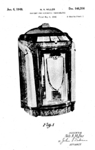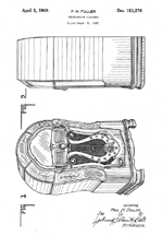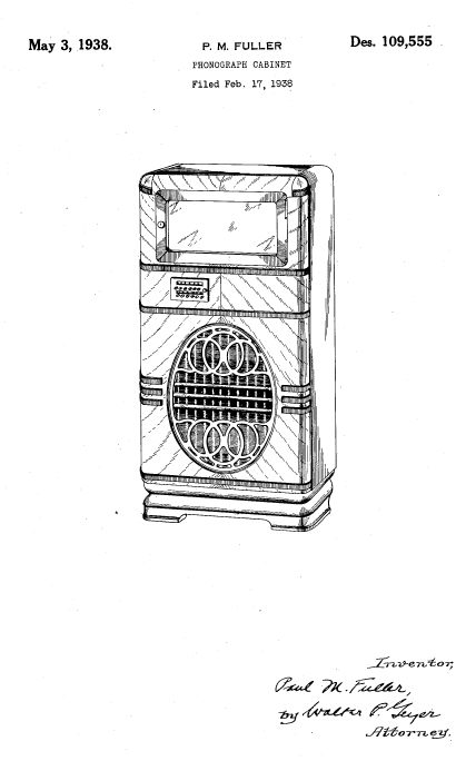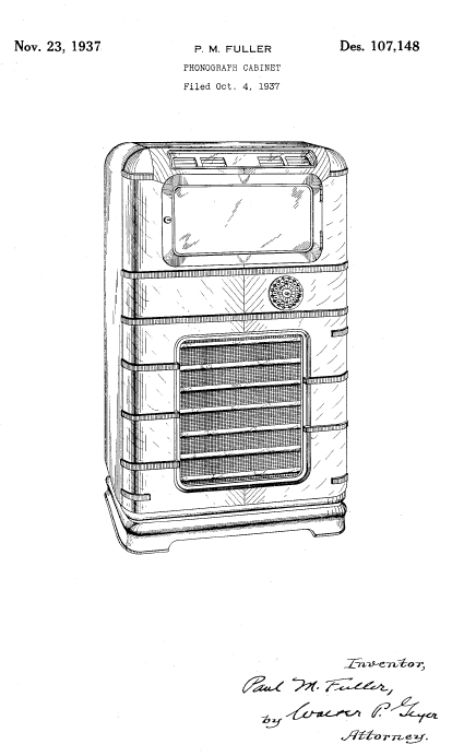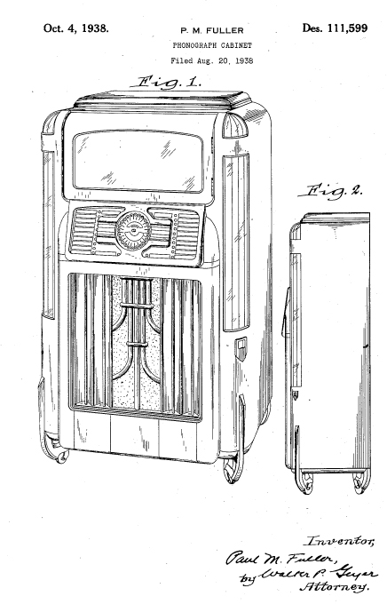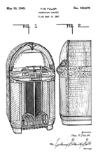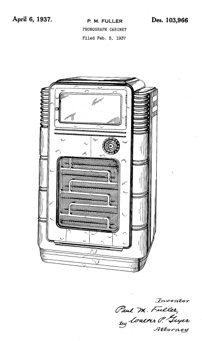 The Wurlitzer Model 51 Paul Fuller Design Patent D111,598 Click to Enlarge Click here if you want to learn how to get Free Patent Drawings Above is the Wurlitzer Model 51, the rarest of all Wurlitzer table models, because it was the only one made without illuminated plastics. It was manufactured in 1937 and reflects the early 30s pre-light-up design. It was probably intended as an "economy" model. Wurlitzer Model 616 Version 1Wurlitzer produced two slightly different variants of the Model 616. Each has a separate design patent (both by Paul Fuller.) All of them used the Simplex (round selector) and had almost no plastic, although Fuller gave them true Art Deco styling. The patent for Variant 1 (sometimes called Grade 1) was filed on February 5, 1937. There is no color used on the machine. These are incredibly rare, and it is hard to find actual photos of them.