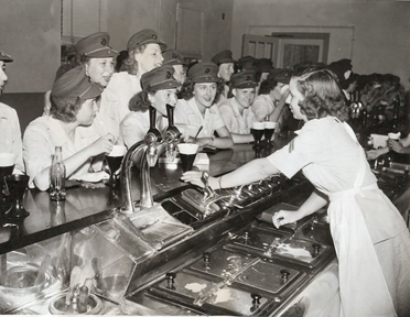 Wurlitzer at War Click to Enlarge There was intense demand for jukeboxes as morale builders on American bases that had spanned the globe. It was said that the Marines came first, the Seabees next, and the Wurlitzer immediately thereafter. Dancing (and the opportunity to socialize with the opposite sex) was the most popular activity at the USO clubs. Worl War II was extremely horrific (to say the least) and the opportunity to hear music from home meant a lot to American soldiers wherever they were. The Women's Army Auxiliary Corps (WAAC) at Ease ...the soda jerk is a coropral Click to Enlarge Doughnuts and coffee were good, but girls were the main event.