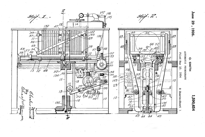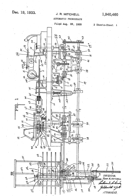 From 1928-1930, Capehart Acquired Numerous Automatic Changer Patents Small Changer Patent (1928) No. 1,792,553 Mitchell Changer (1928) Patent No. 1,840,460 Erbe Changer (1929) Patent No. 2,012,185 Collison Changer Patent (1930) No. 1,955,534 Click to Enlarge Click here if you want to learn how to get Patent Drawings As shown above, Capehart purches a number of patents for automatic record changers. He was forced out of the company by investors in 1931 after the Smalls record changer had a disastrous failure. The home appliances (Amperion) division was purchased by Philo Farnsworth the inventor of Television. In 1932 Capehart formed the Packard Company that acquired and refined the Simplex mechanism for automatic record changing, and sold the device to Wurlitzer. Capehart went to work as operations manager for Wurlitzer and his aggressive sales techniques and superior programming skills brought Wurlitzer to the top of the Jukebox market. His attachment to the Simplex mechanism kept Wurlitzer isolated from technology developments and contained the seeds of that company's demise. Packard was inactive between 1932 and 1939.