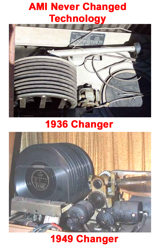 AMI Tecnical Underpinnings Automatic Player Piano Patent No. 1,071,640 AMI Changer Patent No. 1,590,654 AMI Used the Same Changer Technology from 1936-1949 Click to Enlarge Click here if you want to learn how to get Patent Drawings During the Depression, the company manufactured a number of Art Deco styled jukeboxes, most noable the Streamliner. Perhaps the most unusual looking jukebox ever made is the AMI Singing Towers produced between 1939 and 1942. The design of moulded glass, stone effect finish and a top light was influenced by New York skyscrapers and was the first to change the colors of the lights as music played. There were also innovations in sound quality. From 1939-1942, this jukebox was sold and serviced by operated by an affiliate of AMI, Singing Towers Inc. Unfortunately this design was never a major commercial success due to mechanical problems. During the immediate pre-war period, AMI also experimented with remote control wall units to allow the customer to select music without leaving his table. In 1939, AMI introduced the Mighty Midget units that were well received by establishments with limited seating space as found in the big cities. During World War II, AMI ceased production of Jukeboxes,and produced electonic equipment for the armed services. At war's end, AMI retained the services of Jean Otis Reinecke, the famous industrial designer who had achieved significant fame for the Hamilton-Beach Milk Shake Mixer and the iconic Toastmaster Toaster, as well as lesser masterpieces (below).
