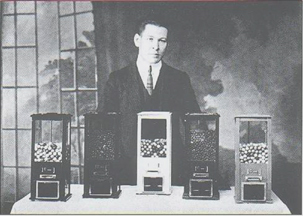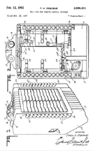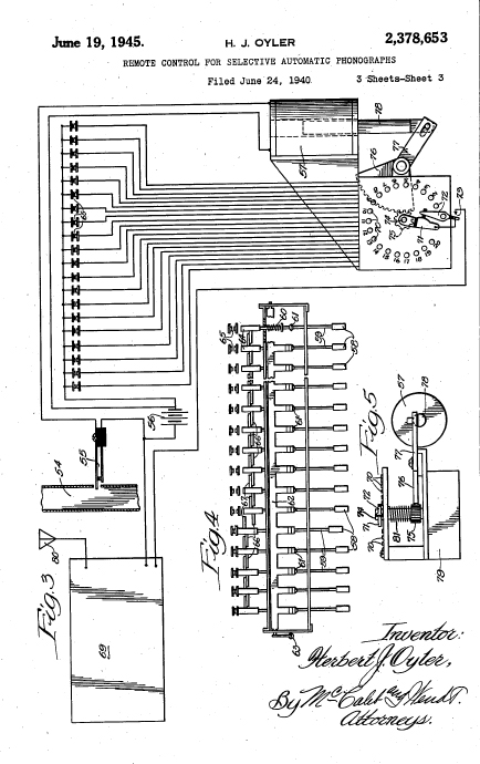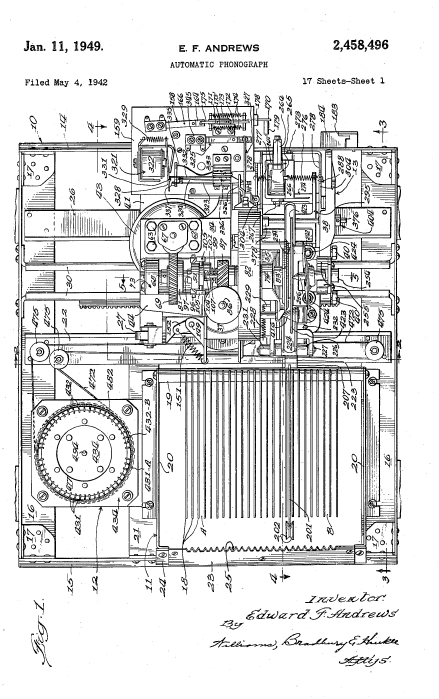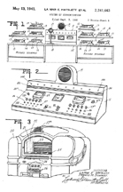 Hollywood Representation of a Telephone Jukebox Setup Fran Valentine is the "Operator" and Whit Bissell is the fellow requesting the song Click to Enlarge One of the sub-plots of the story is a rivalry between a jukebox company and the phone DJ system. In reality, the phone-based system never caught on, and many industry leaders concluded that twenty selections was all people really wanted. Seeburg was only a minor player in Telephone Jukebox, and we're going to cover this topic in depth (below) in the section on the dominant telephone juke player, the Rock-Ola Company. Like most factories during the Second World War, Seeburg went into the development and production of electronic equipment for the US Armed Forces. This total conversion to war work continued to the end of World War II and brought the company three Army- Navy "E" (for excellence) Awards. (Wurlitzer only got one.) Seeburg did not have an invetory of machines and lost out on the demand for placement in military establishments. Defense contracts got the company through the war, and by all accounts, the Seeburg company served the country well. Edward Andrews M100 Changer Mechanism (Top View) Patent No. 2,458,496 Click to Enlarge Click here if you want to learn how to get Patent Drawings In the period immediately after the war, Seeburg continued to produce the various "Symphonola" models shown above. In 1945, Edward Andrews joined the firm and developed a radically new mechanism that could be adapted to play a very large number of records. In 1948, Seeburg unveiled the Model 100 A (or Selectomatic) and revolutionized the jukebox market by offering 100 selections. In the period 1945-1955, Americans discovered the "magic" of quantity -- they wanted bigger products and more selection. The emergence of a teen market resulted in musical taste fragmented along generational lines. Since bigger was better, 20 jukebox selections was no longer enough, and Seeburg was the only company ready to satisfy the market. From 1950 on, Seeburg dominated the jukebox market by technological innovations. They were among the first to adapt to 45 rpm records, they introduced the M200 with 200 selections; they left the arch and curves of the 1940s behind for jet-age modern machines with straight lines and chrome fixings. Finally, Nils Miller put the intriguing new changer mechanism on display under a transparent plastic dome. This was Seeburg's most successful era. Over the ensuing years improvements and modifications were made to Seeburg's machines, and they remained the industry leader for some time. In 1953 they introduced high fidelity reproduction, with phonograph model HF100G, a wide-range, multi-speaker instrument with low distortion. Two years later came the first 200 selection jukebox, which also came with another ground-breaking innovation - the electronic memory unit, which was used to "remember" and then play multiple selections. Seeburg had an active corporate life until the 1980s when a series of mergers, acquisitions and the like expanded the company's business lines to include vending machines, musical instruments and satellite broadcasting. The Rock-Ola CompanyThis was a dynamic company headed by an energetic and innovative Canadian named David Collin Rockola. His work began in the 1920s and included all kinds of mechanical devices including parking meters and motor scooters. David C. Rockola and Bubble Gum Machines The Rockola Company was manufacturing jukeboxes long before the Rock'n'Roll era Click to Enlarge The company name "Rock-Ola" is not a portmanteau as "victrola" is a combination of "Victor" [Talking Machine] with "Pianola" [musical instrument.] Rockola was Russian, not Italian as many assume. His father, George, a blacksmith turned inventor (developing and patenting a double-stroke pump in 1906) immigrated to McCauley, Canada from Byelorussia in the 1890s. Rockola’s industriousness and determination were exhibited at an early age. While living with his mother, Sarah (then separated from his father) in Virden, Canada, young David and three of his four brothers built the house they lived in. At age 14, David left home after his mother died and worked his way through several Canadian cities. He worked as a mechanic in a vending machine factory.. It was not higher education but skills acquired on-the-job that enabled him to do wonders with machinery. At the age of 23 Rockola moved from Manitoba to Chicago and started a small dealership in coin-operated scales. These "Penny Scales" were a very popular novelty and soon David started making them as well as sellling them. He did well at both aspects and soon the Rock-Ola Scale Company was a thriving enterprise.