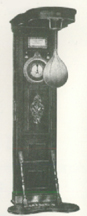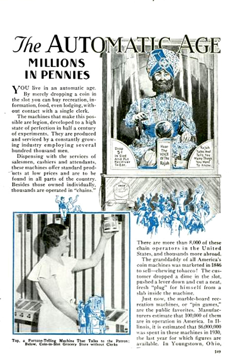 Otherwise, just keep scrolling down to have alook at the companies that made the jukeboxes. Why Go Into the Jukebox Business?Two social factors helped fuel the growth of the jukebox. First, the public was thoroughly fascinated with the idea of "automatic service." An aricle from 1932 describes this trend: Social Fascination with Automated Sales Click Here to download "The Automatic Age" From the October, 1932 issue of Popular Mechanics Click to Enlarge Second, there was real money to be made. In reading this section, you must remember that a nickel was worth a WHOLE LOT more during the Depression than it is now. It was not uncommon for laborers to make less than 25 cents per hour. Here are some statistics from the Works Progress Administration (WPA), the emergency employment service that put people to work during the Depression: ".. (Washington, DC) In January, 1936, 35,350 people (7.3% of the DC population) worked for the WPA.. there were four skill levels.. unskilled workers receiving $40/mo., semi-skilled workers getting $58/mo, skilled workers at $72/mo and professional/technical workers at the maximum rate of $79/mo .." [Source: The Washington Daily News February 12, 1936] In 1936, the workweek was 48 hours long, so these wages translate to 24 cents/hr for unskilled workers up to 43 cents/hr for "professionals." These were "good jobs" in the middle of the capital of the USA and wages were much lower outside urban areas. The average working man would have to put in from 15 to 20 minutes of labor -- digging ditches, running a punch press, operating a sewing machine, etc to earn the money to hear 3 minutes of recorded music on a jukebox. [78 rpm records that were technologically limited to 3 minutes per side.] The jukebox was more like a skilled professional or middle manager because it could earn up to $1 an hour, assuming continuous play. To help you get an even better idea of what a nickel would buy, here are some examples of prices in the 1930s: Value of a Nickel in 1936 From the St. Petersburg Evening Independent April 7, 1936 Apples were Five Cents per Pound Click to Enlarge The value of a nickel did not decrease that much during World war II or even into the early 1950s, when the United Steelworkers went out on strike for 53 days over an 8 cent per hour wage increase (they wanted 12 and got 4). (Parenthetically, the Steel Strike link also introduces Homer Capehart who was also influential in the jukebox industry, as detailed below.) Inflation has reduced the value of a nickel to the point where coin may not even exist next year, much less in 2050! The point of this economic discussion is that in the 1930s, it was definitely worth investing time, materials and brainpower to capture nickels. The Wurlitzer CompanyRudolph WurliTzer founded the famous WurliTzer company in 1856 (an yes, he spelled it with a capital T in the middle.) Rudolph had three sons, Rudolph Jr., Howard and Farny, all of whom worked for the firm. Starting in Cincinnati, Ohio, they initially imported European music machines including the products of the Regina Music Box Company. By the 1890s, they were the largest distributors for Regina. In 1900, a manufacturer of merry-go-round organs developed a coin operated automatic piano, called the DeKleist Tonophone, asked WurliTzer to distribute it. The machine was a success making DeKleist a millionaire. They also convinced Regina to add coin slides to their larger music boxes. In 1909, the WurliTzers bought out DeKleist acquired a factory in North Tonawanda, New York. Back in Cincinnati, Farny Wurlitzer was having an affair with his secretary, and eventually married her. This was apparently a family scandal and the newlyweds were banished to Tonawanda. Exiled to make something of DeKleist, Farny Wurlitzer created a whole new industry and eventually established the WurliTzer headquarters in the small upstate New York town near Buffalo. The Wurlitzer factory grew to be nearly one quarter mile long. It was the largest woodworking, metal working and assembly plant in the world devoted to the production of musical instruments. It produced tens of thousands of pianos over the years and every one of those fantastic Wurlitzer Jukeboxes was made there. The Wurlitzers became world famous by building and promoting large pipe organs for use with silent movies in the palatial movie theaters of the 1920s. No big city silent movie was complete without a virtuoso performance on the "Mighty Wurlitzer." As the nation's premier movie palace, Radio City Music hall had the biggest, most complicated Wurlitzer organ with two consoles that were transported into the theater on their own elevator.