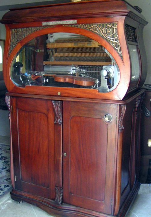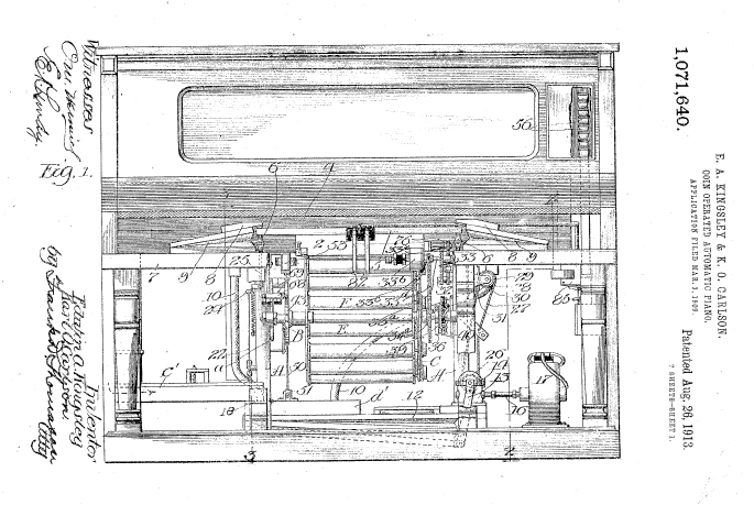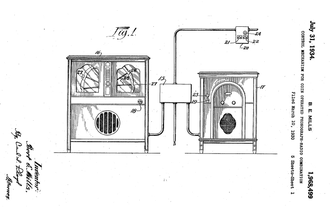 The Mills Company and Coin Operated Music The Violano-Virtuoso Automatic Violin Player Henry Sandell Patent for the Violano No. 807,871 Mills Coin Operated Radio-Phono Patent No. 1,968,499 The Mills Remote Control for Radio-Phono Click to Enlarge Click here if you want to learn how to get Patent Drawings JUKE BOXES: Between 1905 and 1930, the company's products included the Mills Violano-Virtuoso, machines that automatically played a violin They were also involved with player pianos. In 1928, Mills entered the market for coin-operated radios and multi-selection phonographs with a gadget that just tacked a coin handler on to either an existing radio or phonograph. Of note, this was probably the first "Remote Unit".