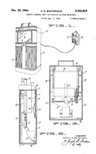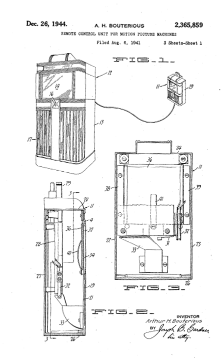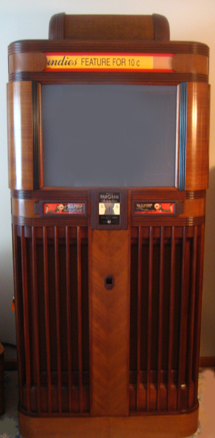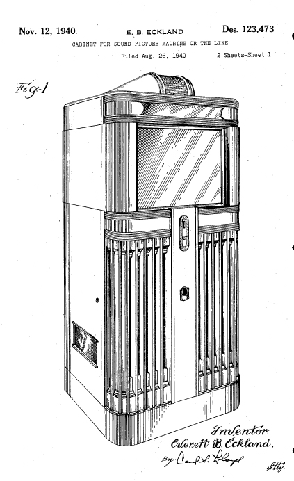 The Mills Company Panoram Everett Eckland Design Patent D-123,473 The Beautiful Panoram! Arthur Bouterious Remote Control Patent No. 2,365,859 Eckland 1945 Sono-Vision Design D-144,702 Click to Enlarge Click here if you want to learn how to get Patent Drawings Mills' greatest contribution to music was indirect through its motion-picture jukebox, the Panoram. Mills was the dominant force behind these big audio/visual machines during the the 1940s because (after decades of experiments) they developed a reliable reel operating mechanism. As shown above, the Panoram was the size of a refrigerator, hosed in an attractive Art Deco cabinet designed by Everett Eckland. The technology used a series of mirrors to reflect the image from an RCA projector onto a 27-inch etched-glass screen. The machines first appeared in 1939 and found their way into countless soda shops, taverns, bus and train stations, and other public places across the nation. The specially-made 16mm films held 8 musical numbers and ran in a continuous loop. A foil strip embedded in the film was the demarcation between segments. Each loop of the tape cost the patron a nickel (eventually a dime). For technical reasons the prints themselves were printed in reverse as the confined space inside the Panoram machines required a complex series of mirrors in order to project the image on to the inside of the screen. The machines could be operated at the box or from remote stations designed by engineer Arthur Bouterious. One major flaw in the technology was that in order to play, say, selection number eight, you had to sit through numbers one to seven first. Initially, the Panoram was a great success and found its way into thousands of bars, hotel lobbies, bus stations, restaurants, etc. across the country. In 1940, there were nearly 10,000 Panorams operating. Here is a good example of a "Soundie" because it features jukeboxes -- although the machine in the clip was made by the Seeburg Company, Mills' arch-competitor. Thanks to our friend Dave, we have identified it as the "Colonel" model.