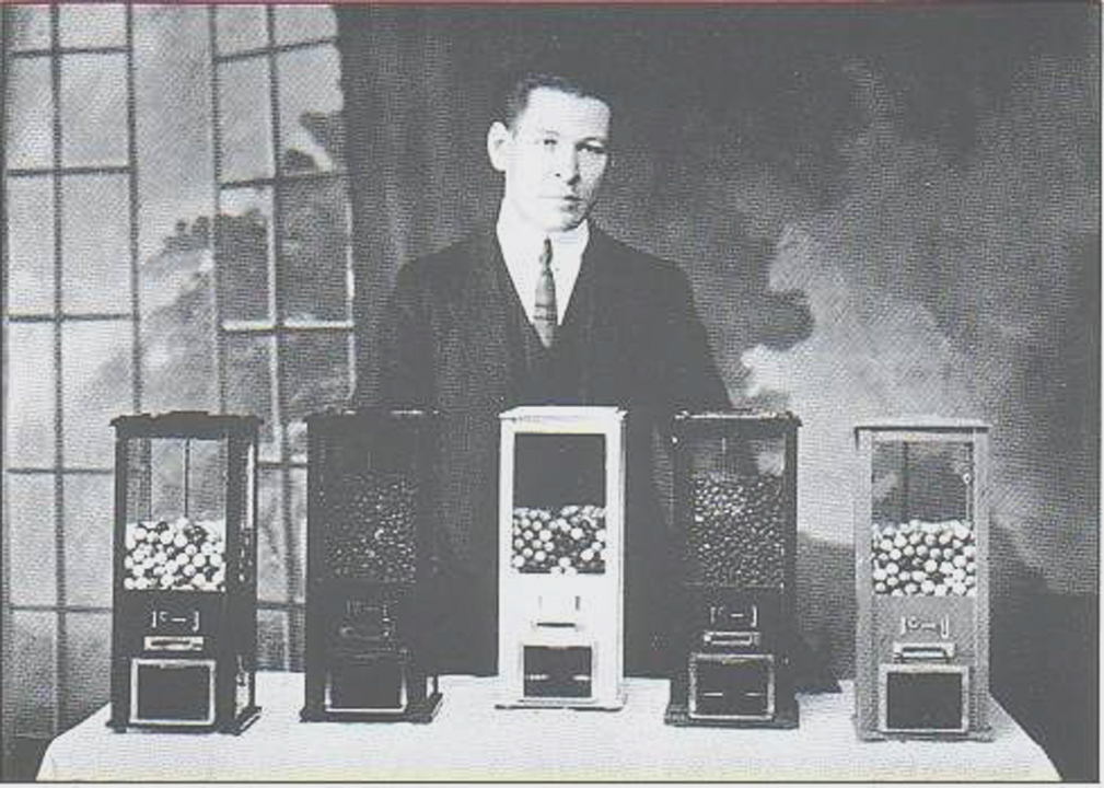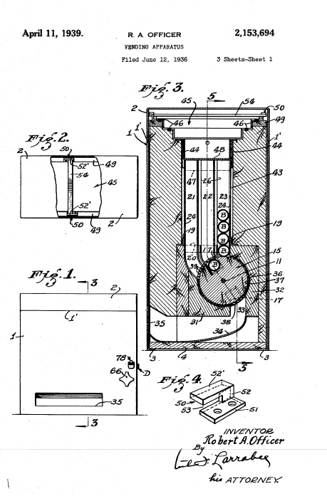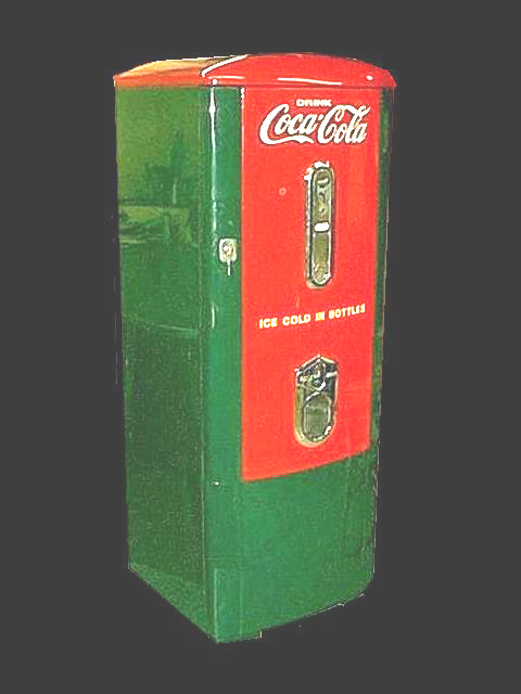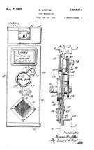 The Mills Company and Vending Machines 1906 Punching Bag Machine Mills Novelty Engraving Machine Bruno Radtke Coin Handling (and Changing) Patent No. 1,869,616 The Mills Model 45 Coca-Cola Machine Click to Enlarge Click here if you want to learn how to get Patent Drawings VENDING MACHINES: Mills would distinguish itself by being one of only a few firms to manufacture bmachines for both gambling and vending. As we have seen, the link between the two is coin handling, a specialty at Mills. By 1910, the company was making elaborate cast iron machines that sold chewing gum, peanuts, and candy. They also had a variety of amusement devices such as a punching bag machine, a weight lifting machine, a film viewer, fortune telling devices and a gadget that engraved a metal name-plate. click here to download a ".pdf" of the Mills Catalogue for 1906 to see and read about all these wonders. Mills made great progress in vending almost everything. After they had acquired the significant coin handling patent developed by Bruno Radtke (1931) they were now able to make change for purchase. This stimulated great interest and gave them a virtual lock on the business. In 1935, Mills was engaged by Coca-Cola to produce a vendor that incorporated refrigeration. The result, models 45 - 47, was the first of its kind for Cola-Cola, and became the iconic "Coke Machine". The vending division was spun off to a subsidiary called Mills Automatic Merchandising Corporation of New York. Herbert's brother Bert E. Mills was involved in the vending business and is credited with inventing the first vending machines to sell hot coffee.