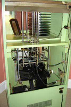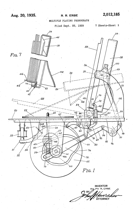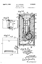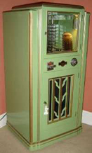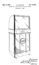 Seeburg's Adventures in Vending Frozen Confection Vending Machine, Patent No. 2,153,694 Refrigerated Apple Vending Machine Seeburg Parking Meter Patent No. 2,198,422 Click to Enlarge Click here if you want to learn how to get Patent Drawings Developing cigarette vending machines, cold and hot drink dispensers, parking meters and the like kept the creditors away. By 1934 the company was debt-free and began to dabble in jukeboxes with the Selectophone. This time, they used a changer designed by Russell Wilcox who had done wonders at Wurlitzer. Instead of bringing records to the tonearm, this changer had a two inch gap between the records and the tone arm was brought to the record. This ingenious device offered the promise of selections limited only by the height of the box. Alas, this change was defeated by the simple fact that records warp and in doing so interfered with the tone arm resulting in jams, especially in summer's heat. This jukebox was also a failure.