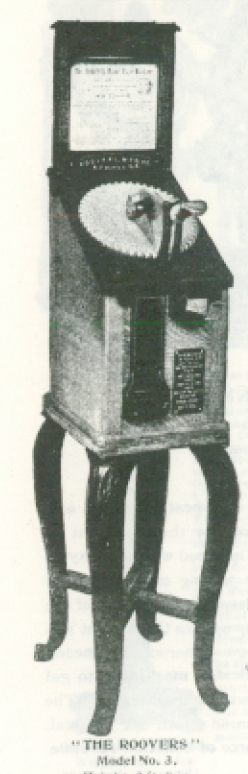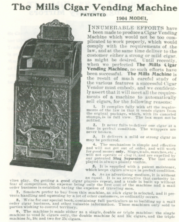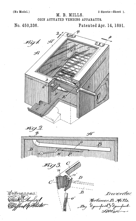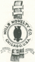 Products from the Mortimer Mills Era Original Vending Patent No. 450,336 Brochure Touting the Virtues of the MBM Cigar Machine The Mills Owl Gaming Machine The Mills Novelty Corporate Logo Featuring the Owl Click to Enlarge Click here if you want to learn how to get Patent Drawings Mortimer Mills was granted United States patent 450,336 on 14 April 1891 for an improvement in "coin-actuated vending apparatus". The improvement allowed the purchaser to "select the product being sold and manipulate it so that it was carried to the point of delivery." Based on this patent, Mortimer Mills founded the M.B.M. Cigar Vending Company in 1895. On the success of the cigar vending machine, the company began manufacturing and distributing the Mills Owl the first mechanical upright cabinet "gaming" machine. This machine had an element of chance -- However, it was left to the establishment to make payments according to a schedule affixed to the machine. The design included a circle of owls perched on a lithographed tin wheel. The machine was a great success and the company adopted an owl motif as its trade mark. In 1898, Mortimer Mills sold a controlling interest in the company to his eldest son, Herbert S. Mills who changed the name of the company to Mills Novelty Company. At that time, the company was located at 125-127 West Randolph Street, Chicago. In 1904, Mills Novelty Company was an exhibitor at the Louisiana Purchase Exposition in St. Louis, Missouri. (this was the setting for the film Meet Me in St Louis.