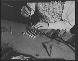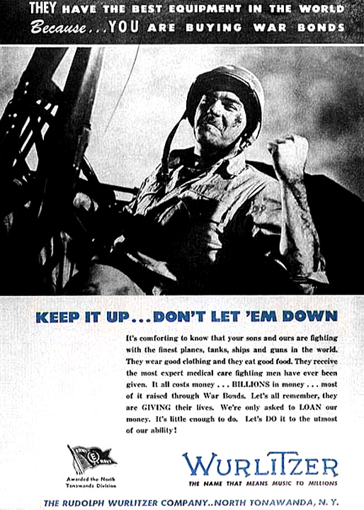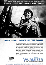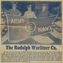 ![]() Scenes from the Wurlitzer Factory Click to Enlarge Here is a company-made video that shows operations at the Tonawanda Plant PART TWO During World War II, Wurlitzer initially shut down jukebox production to manufacture precision electronic instruments for the Armed Services. The woodworking shop, famous for pianos, organs, and fine cabinets of all sorts, was put to work making parts for transport planes. The company won (and proudly displayed) a production efficiency ("E") award.