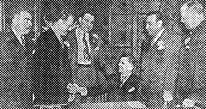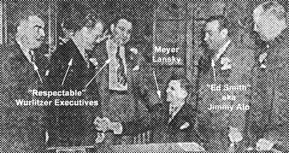 Heierarchy in the Detroit Jukebox Racket William Bufalino, Angelo Meli and James Riddle Hoffa Click to Enlarge Of note, the investigation of Teamsters Local 985 in connection with the jukebox rackets led first to William Bufalino, head of the local, to Angelo Meli, head of the Detroit Crime Syndicate and thence to Jimmy Hoffa. Once Hoffa got into the national spotlight, it glared at him until he was convicted and sent to prison. In the 1930s, New York was the center of both population and the entertainment industry. It is therefore logical that the revenues to be had from jukeboxes in New York and its immediate surrounds (New Jersey and Connecticut) would be immense. New York was also the center of organized crime, and it follows that the jukebox industry would be a prime target. This was the case, in a most spectacular fashion. The New Wurlitzer Distributor for NY, NJ, and CT (seated) Meyer Lansky, Legendary Syndicate Kingpin "Ed Smith" (possibly Jimmy "Blue Eyes" Alo) Various "Respectable" Wurlitzer Executives Click to Enlarge "... At a trade gathering, several Wurlitzer Company executives presented Meyer Lansky and his associate Ed Smith to the Eastern box operators. Said Wurlitzer official Mike Hammergreen: 'We know that in Meyer Lansky we have a man who is liked and respected by everyone.. we are confident that Wurlitzer's new distributor in New York, New Jersey and Connecticut will make many new friends." When questioned about his plans, Lansky intimated that he 'would much prefer to have his actions speak for him' ..." This revelation was nothing short of astounding because Meyer Lansky was one of the top figures in the Organized Crime Syndicate and had bee identified in the press as such for many years. He was known primarily as the mob's chief banker but he was also involved in the formation and management of organized crimes liquidation department -- the notorious Murder Inc.. In 1934, Lansky's name may have been unfamiliar to the general public but his connections to organzized crime could not have escaped the editors of Billboard ... or Wurlitzer! You might be interested on the background for the entry of Mr. Lansky into the world of jukeboxes. It started several years before in the seedy hamlet of Hallendale Florida