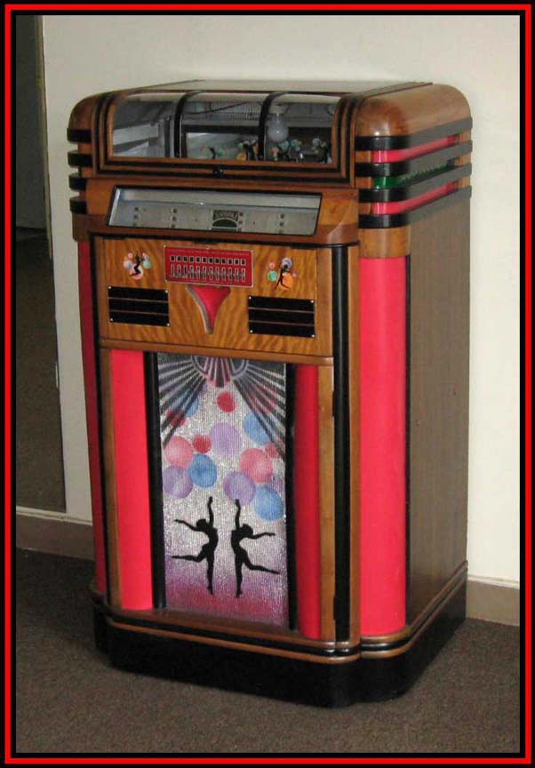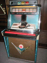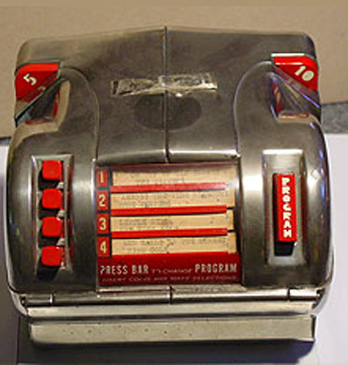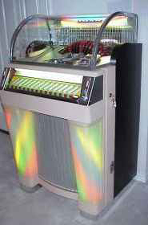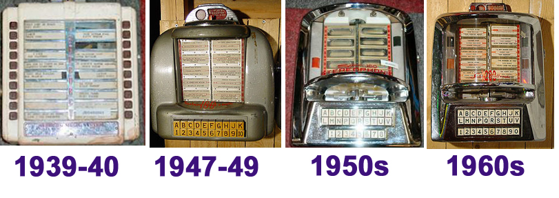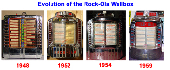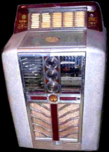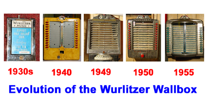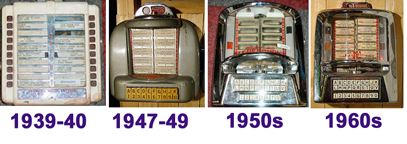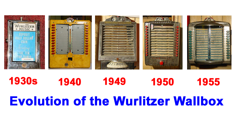 Wurlitzer Model 750 Jukebox Entertaining African-American Troops Everything was segregated in the US Army in World War II Circa 1944 Click to Enlarge After the war, Wurlitzer, like other companies, struggled with materiel and skilled labor shortages. Howver, the introduction of the now classic Model 1015 jukebox in 1946 restored the company to pre-eminence in the jukebox field. Fifty six thousand 1015s were sold in less than two years. The company was, however, resting on its technological laurels because it continued to use the 1930-era Simplex changer mechanism that was limited to playing one side of a record, and for practical purposes, limited to 24 selections. The peak of Wurlitzer's fame came in 1949 with the bullet-nosed Model 1100. Wurlitzer's 20 Years at the Top The beginning and the end of the famous line of jukeboxes... Click to Enlarge Wurlitzer was also a player in the wall unit business. The industry hypothesized that the customer would be much more likely to part with his nickels if he could make choices right at his table without getting up and walking to the box. This proved to be a major technical challenge and, as we'll see below, other companies were more adept in creating these "wallbox" systems. Here is a retrospective of Wurlitzer's efforts in this field. The series begins with the Model 5010, which simply allowed the customer to insert change and play the "Top Ten Tunes" for half a dollar. A fifty cent piece was required.