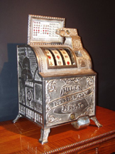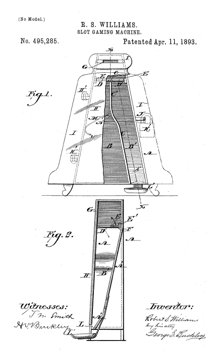 The Mills Company and Slot Machines Williams 1898 Game Patent No. 495,285 (Looks like a Liberty Bell) Charles Fey, Father of the "One-Arm Bandit" Slot Machine Herbert Mills, Entrepreneur -- a well-dressed, sly looking fellow The Mills Liberty Bell Slot Machine Click to Enlarge Click here if you want to learn how to get Patent Drawings SLOT MACHINES: Most contemporary sources hold that a Bavarian immigrant named Charles Fey invented the "One-Armed Bandit" slot machine in San Francisco. This was the first machine to make automatic payments for a pre-determined sequence of outcomes. As such, it was much more popular with bar and saloon owners because it took care of itself. Fey made a small fortune by splitting the proceeds 50/50 with the barkeeps. The Mills official history implies that in 1907, Herbert S. Mills "collaborated" with Charles Fey, to produce the Mills Liberty Bell. The same contemporary sources hold that Fey was unable to keep pace with demand for slot machines and that the Mills company produced a look-alike. The San Francisco earthquake of 1906 wiped out Fey's factory and equipment and he was forced into partnership with the Mills company. The "Liberty Bell" machine was so named because the big jackpot was paid when three bell symbols lined up in the game windows. The contribution of the Mills company seems to have been the use of fruits (cherries, lemons, grapes) as symbols on the spinning wheels. Our research has, however, turned up an "Automatic Gaming Device" (Patent Office euphemism for gambling device) invented by R.S. Williams that is in the actual shape of the Liberty Bell. For whatever reason, this imagery persisted, and all Mills slot machines were manufactured by a subsidiary called the Bell-O-Matic Corporation.