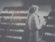 Evolution of the Seeburg "Jukebox Wallbox", 1940s-Current Patent for Seeburg Jukebox Remote Control, No 2,378,653 Click to Enlarge Click here if you want to learn how to get Patent Drawings AS we have hinted in the discussion of jukebox economics, all the major manufacturers sought to increase revenue by bringing the selector ro the customer. This was done through units mounted at each table, saving the customer trips across the crowded dancefloor to insert his nickels. In 1939 Seeburg got into this game with the "Wall-O-Matic", a wall box communicating to the master phonograph using a thick twenty-wire cable (one for each selection.) Selections were sent to a central machine used radio frequency signals. At this time, the Seeburg jukeboxes acquired military rank (Colonel,Major, etc.) to emphasize that they were capable of "commanding" a network of remote locations. Telephone Jukeboxes As we have noted in our Jukebox Mechanics page, the size of the changer more-or-less dictated the volume of the cabinet. About 20 records was the limit if the box was to fit into a reasonable space and have simple enough mechanicals to be reliable. Some executives (most notably Homer Capehart) could not believe that customers could deal with more than 20 selections. Bill ("64K is enough") Gates was to make a similar gross underestimate nearly 40 years later. There was some truth to the "20 is Enough" philosophy as illustrated by the Telephone Jukebox in which fifty jukeboxes were linked by telephone lines to a central station where female "disc jockeys" would take requests. Although selection was theoretically infinite, most setups had about 250 titles in addition to the 20 on the "local" phonograph. An actual "Telphone Jukebox" facility was shown in the grade B- film The Crime Doctor's Diary, a spin-off of the popular Crime Doctor radio series. Here are some stills from that film showing the bank of turntables, a closeup of an individual turntable and the unit in the retail location.