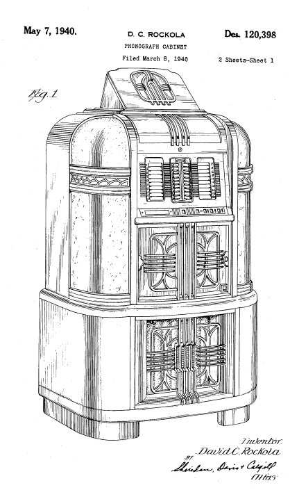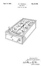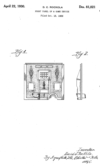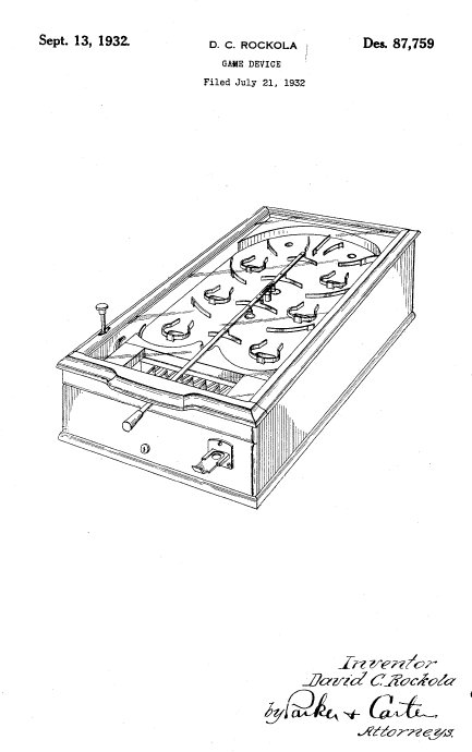 Evolution of Rockola Business from Scales to Slot Machines Scale: Patent D-83,280; Pinball Patent D-87,759; Slot Machine, Patent D-81,021 Click to Enlarge Click here if you want to learn how to get Patent Drawings Rockola noted that the Pinball machines he encountered when placing his scales were very popular. Soon Rockola began manufacturing them as well. Unfortunately, his game (called "juggleball") was introduced just as the Depression hit. Like others in the coin operated machine field, Rockola felt the pinch of hard times and soon found himself deeply in debt. In a masterpiece of negotiation Rockola managed to persuade his backers to continue with the company. According to the official company history, "..In the next three years the Rock-Ola company restructured to sell coin-operated games, and Rockola paid back his investors..." Unfortunately, these "coin operated games" were slot machines, and David Rockola was tainted with ties to organized crime. [We will treat the subject of jukeboxes and crime in a section below, since all manufacturers were involved to some extent]