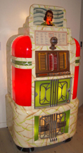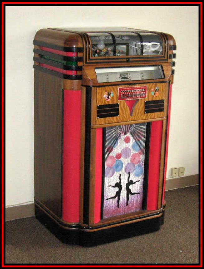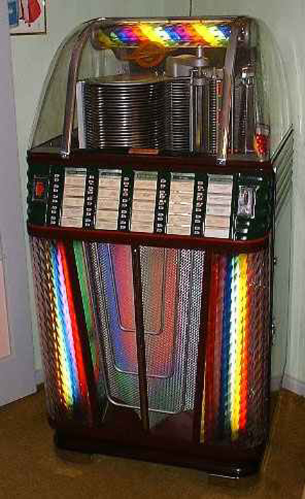 Seeburg Ads suggesting that the Juke was High Class Click to Enlarge As you might guess, there is a little sociology involved here. Manufacturers were continuously improving the technology and appearance of their products, sometimes with new variants issued on a monthly basis. The "very latest" machines with the most features and the best styling were designated "Top Boxes" and were destined for high end establishments. As the new moved in, the old was recycled down the status chain (of the time) until they reached rock bottom in the seedier roadhouses. In those bigoted times, when the machines reached into Negro neighborhoods, they acquired their enduring name, since "Juke" was slang at the time for "dancing". This is a lot less of a mouthful than "automatic coin operated phonograph," so like "Jitterbug", "Zoot" and "Rebop" the African-Americans had the last word. On a sad note, after the machine had been recycled down the chain, it was scavenged for parts and the rest destroyed. This is why boxes from the 1920s and 1930s are very rare. We Really Smash Them Wurlitzer Trade Ad from the 1930s By a new jukebox! The old one won't compete with you... In 1942-1945, they were sent overseas with the Armed Forces Click to Enlarge The Model 1015 had the largest production run of any single jukebox model. Wurlitzer estimates that more than 60,000 of the units were shipped. With bubbler tubes that changed colors, it was very entertaining -- so much so that owners preferred to keep this model instead of switching to newer boxes, even those with much improved technology. When the industry moved from 78 rpm to 45 rpm records, many of the 1015s were retrofitted and continued to serve in the 1950s. The natural downward evolution of the jukebox placed this machine in malt shops, drug stores and other places frequented by teenagers just at the time that Rock'n'Roll was emerging. The 1015 is, in fact, an icon of teen culture in the mid-1950s even though it was introduced in 1947 to play the music of their parents (see ad above.). It is the most often pictured jukebox and is immediately recognizable today. In fact, the remnants of the Wurlitzer company still makes them today -- they play CDs and some even use iPod technology to offer thousands of selections. If this has been boring, you have a some choices now:
