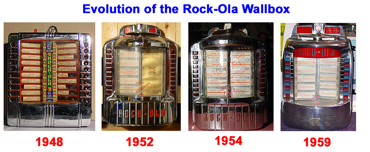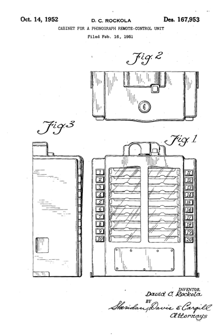 Evolution of the Rock-Ola Wall Unit Line 1948-1959 Original Design patent D-167,953 Click to Enlarge Click here if you want to learn how to get Patent Drawings Rock-Ola was also a player in the remote control wall unit juke box business. Both the "Spectravox" and "Commando" lines were specifically engineered to be used with remote wall units. Seeburg outpaced Rock-Ola and Wurlitzer finished third. By 1960, Rock-Ola and Seeburg dominated the market. Clearly the wave of the future was technology, particularly that which enabled a large number of selections. Rock-Ola finally outdid Seeburg with the Rocket,Comet and Tempo series, all of which had cabinets that appealed to teenage fantasies of Space Travel and Fast Cars. Notice the curved glass "nose cones" and the pseudo Cadillac "V" grille on the front of the Tempo.