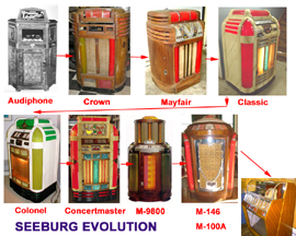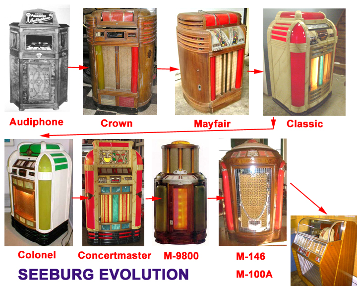 N.M. Seeburg and the Evolution of the Seeburg Jukebox, 1927-1950 Models shown represent "lines" -- each line had upscale and downscale variants Click to Enlarge The various different models of 'Symphonola' including the Crown,Casino, Classic, Colonel, Commander, Hi-Tone, and the Model S-146,the last being affectionately known as the "Trashcan". All of these product lines and their variants are discussed in detail in our Aesthetics of the Jukebox page. Seeburg was at the forefront of new technology including key experiments in providing high quality sound. However, they were never quite able to keep up with their competitors. One major problem with the Seeburg machines is that the customer could not see the record changer. Amidst all the high technology (for its time) the Seeburg designers missed the obvious entertainement value of the changer. Without animation, the Seeburg jukeboxes were just furniture. This was probably the earliest demonstration of the value of "User Friendly" in electronic commerce.