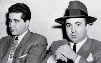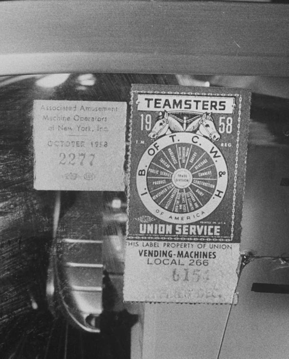 Meyer Lansky and Vincent "Jimmy Blue Eyes" Alo Click to Enlarge Lansky was the basis for the character Hyman Roth and Alo was the basis for "Johnny Ola, Roth's Sicillian Messenger Boy" in The Godfather, Part II In 1929, Vincent "Jimmy Blue Eyes" Alo was introduced to Lansky by Lucky Luciano, Since Lansky was a valuable money-maker, Luciano wanted Alo to guard him. Both Lansky and Alo were introverted, bookish men who wanted to become legitimate businessmen. The two mobsters soon became friends. At the time, Lansky was setting up a partnership between the police, politicians and merchants in Hallendale, a rundown village outside Miami. Lansky built a small casino that made unbelieveable amounts of money, drawing gamblers from all over the south. The crowds threatened to blow the cover from his operation and wreck his carefully orchestrated partnership with the authorities. Clearly, the market for gambling had not been saturated, so another, and then another "underground casino" was opened. This was followed by Gulfstream Park and horse racing. The fountain of cash from Hallendale had to be laundered, and hence Lansky and Alo formed the Simplex Distribution Company and got the Wurlitzer franchises discussed above. All worked fairly well throughout the "golden Age" of the jukebox. The move into jukeboxes also gave Lansky and Alo control of the popular music outlets during the 1940s in the massive New York market. To no small degree Frank Sinatra's amazing career took off as a result of the hoods' control of what records appeared in their jukeboxes. Unfortunately for Sinatra, the mob was simultaneously pressing millions of bootleg copies of Sinatra's records and selling them from record store outlets. The mob giveth and taketh away. By 1947, growth in Broward County had gentrified Hallandale. The casinos there were pretty dilapidated and Lansky sold them to locals, turning his attention to Las Vegas and Cuba. The local yokels were no match for "Good Government" and in 1947 the city was cleaned up and rechristened "Hallandale Beach." Gulfstream Park was spared. Teamsters Sticker From 1958 Did the Mob Exit the New York Jukebox Business in 1947? Click to Enlarge In the same year, Lansky sold Simplex Distribution to a group of supposedly non-mob investors. Wurlitzer maintains that it knew nothing of Lansky's activities until 1947 and that Lansky gave up the franchise as soon as Wurlitzer requested it from him. If you believe that, maybe you also believe in the tooth fairy.