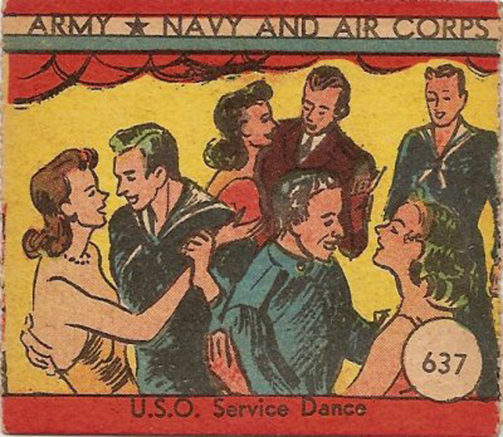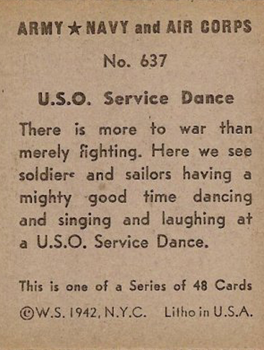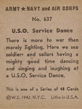 Dancing Was the Principal Attraction at the USO ...even in Trading Cards Collected by Kids Click to Enlarge The 48 card set, 'Army-Navy-Air Corps' is of great interest to card collectors, especially for the wartime propaganda on the back. It was issued in 1942 by the W.S. Company; cards can sometimes be found still attached to one another in strips, and these are considered more valuable. The Burdick Catalogue number is R18 Because Wurlitzer had access to a large number of machines under lease, they were able to ship jukeboxes (especially older ones) all over the world, setting the stage for an enormous increase in international business at war's end. Here are some Office of War Information (OWI) photos showing: (a) A Wurlitzer Model 500 (c. 1938) in a 1944 USO Club and (b) a Wurlitzer Model 616 (originally made in 1937) doing duty in a USO Canteen in 1943.