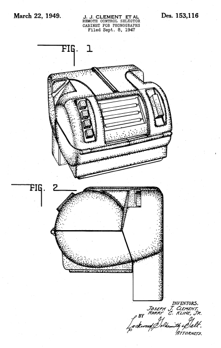 Wurlitzer Bar Remote Control Patent No. D-153,116 Click to Enlarge Click here if you want to learn how to get Patent Drawings The company's fortunes declined because they were blindsided by the recording industry's move to the smaller 45 rpm record and because they were not as innovative in mechanical design as they were in exterior decor. In 1949, Seeburg introduced a breakthrough record changer that offered 100 selections (instead of 24) and would handle 45 rpm records; by doing so, they quickly overtook Wurlitzer and dominated the jukebox market. Of all things, Wurlitzer's response was to lease older jukeboxes to places that would have been declasse in the 1930s -- drug stores, malt shops, diners and the like. Thus, the Model 1015, originally intended for the cocktail lounge crowd, found itself smack in the middle of the 1950s newly empowered consumer: the American Teenager. For this reason, the Model 1015, technologically obsolete and over-adorned in the "less-is-more" aesthetic of Danish Modern, found its way into the hearts and pocketbooks of a whole generation. Rock and Roll and the 1015 are almost inseparable, both then and now. The Wurlitzer is often used as a prop to invoke the 1950s in period films and television.