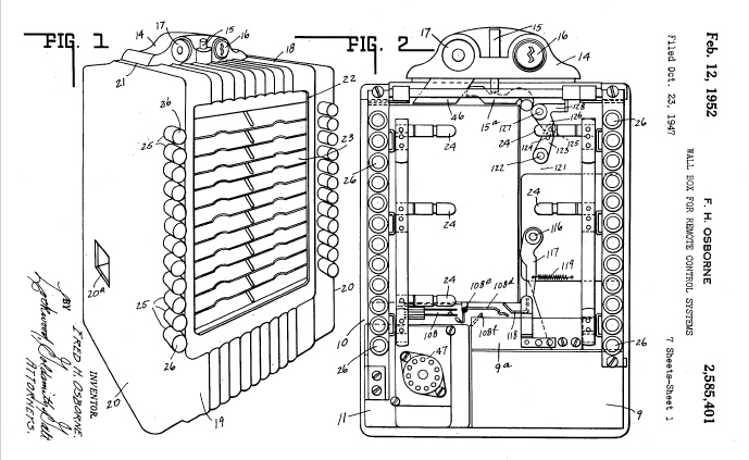 Wurlitzer's Experiments in Wall Boxes Wurlitzer remote unit Patent No.2,585,401 Click to Enlarge Click here if you want to learn how to get Patent Drawings Wurlitzer had one unique device, called the "Bar Box." This was a remote station in a compact package that could be placed on the bar without taking up an inordinate amount of room. This provrd to be popular with tavern patrons