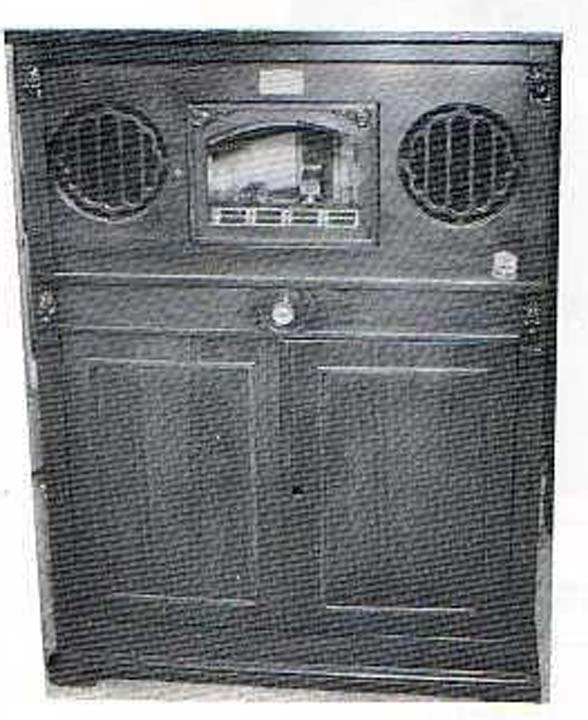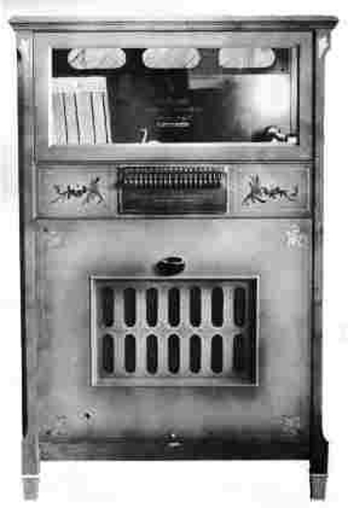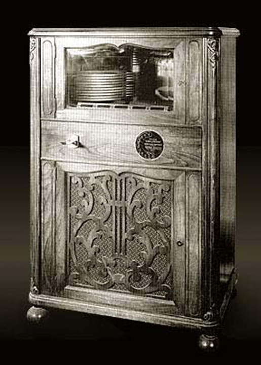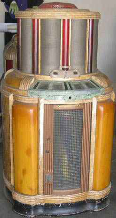 Jukeboxes When They Were "Boxes" The Wurlitzer Debutante, c. 1930 The Seeburg Audiphone, c. 1928 National Amusement (AMI) Model A, 1928 Click to Enlarge The general tone of American Society in the Swing Era was that (a) Things couldn't be much worse than the Great Depression; and (b) Science is going to provide a wonderful future for everyone. The former is probably true, but the latter has been marked with mixed success. Howver, Faith in the Future, stimulated by the 1933 Columbian Exposition and the 1939 World's Fair created an intense popular interest in new styles and new materials. The Depression was pretty dull -- people liked things that were new and bright. In the discussion on aesthetics below, we're going to get into this in a lot more detail. However, out technical look at jukebox design will be devoted to the orderly business process of introducing new designs to the market. It is important to note that the Jukebox of the 1930s had a regular life cycle. A new "Top Box" was placed in a high value environment, and gradually was sent down the value chain until it was salvaged. The various companies had a fairly large investment in mechanicals - the patents, production machinery and service training -- so they were reluctant to introduce radical changes in the underlying "hardware." Following the lead of the auto industry, jukebox manufacturers devoted most of their model changes to the exterior. While the appearance changed every year, the mechanicals changed very gradually -- in 1947, Wurlitzer jukeboxes were using a changer mechanism that was quite similar to that in 1930, the models differing only in terms of refinements that would increase revenue: more selections that were easier to make. As we have seen, AMI and Seeburg tried to compete on the basis of sound quality, but made only limited intrusion into Wurlitzer's market. Seeburg only took off when it offered a 100 (and then 200) selection machine. One consequence of the relatively unchanging internal mechanism were limits on the size and shape of the exterior. During the period 1930-1950, Wurlitzer machines "evolved" slowly from the "Box" to the "Arch" shape that has become iconic. All of the mcahines were designed by one man, Paul Fuller. The photo below shows the beginning and the end of the evolutionary process. In general, the year-to-year changes revolved around the vertical elements (the Pilasters) and the changer display in the "Crown". The early model lets you look at the changer through a window. The final model has a clear plastic nose cone that reminded many of the bombardier's compartment on a B-29. Evolution of the Wurlitzer Jukebox in the Golden Age From box to arch... Model 600 and Model 1100 pictured Click to Enlarge Click here if you want to learn how to get Patent Drawings