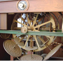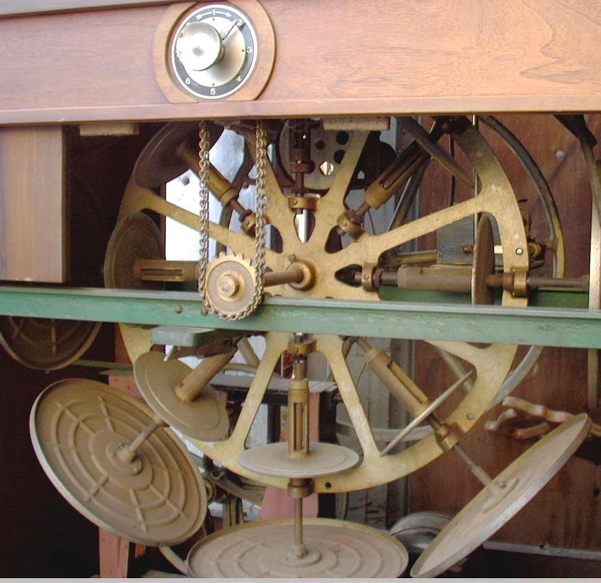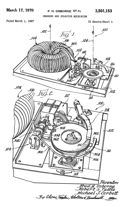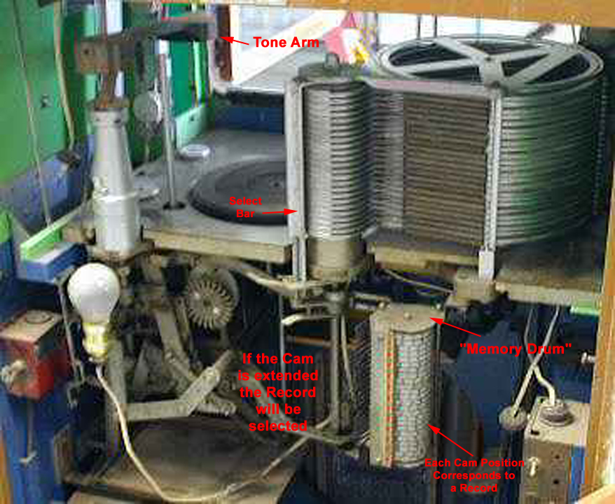 Evolution of Playback Technology Patent to Play Both Sides of a Record, No. 2,205,268 Chain Driven Multiple Stack Patent No. 2,574,598 (probably more fanciful than real...) Toroidal (donut-shaped) Changer Layout No. 3,501,153 Click to Enlarge Click here if you want to learn how to get Patent Drawings Here is a video of the restoration of a jukebox with the toroidal record store. Now, on to Selection... Selection MechanismsHere is a video of the Wurlitzer Simplex Multi-Selector push-button system being operated. This will help you get through the following diagrams. As you'll recall, the select bar is raised and lowered to engage the correct carrier to deliver the record to the turntable. The device that controls the select bar is called a memory drum and is illustrated in the photo below. The drum has been swung out from its normal position to the service position -- this also shows the mechanism a lot better. The drum is made up of a series of drum-wheels each corresponding to a particular record. Each drum-wheel has a number of movable cams on the circumference. When the cam is set, the record corresponding to the wheel will be played. Thus, "selection" is the process of setting these little cams.