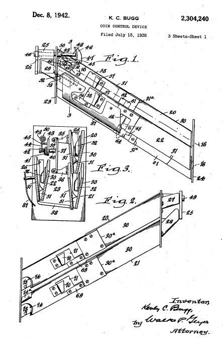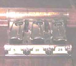 The Coin Slide Mechanism for Vending machines Patent No. 2,212,714, one of a number of such patents Coin Slide on a Wurlitzer Model 24 Jukebox Click to Enlarge Click here if you want to learn how to get Patent Drawings Once the coin entered the machine, it was subjected to further testing. A device with a series of cams was used to detect raised figures on the coin. These are small pins that move up and down as the coin passes beneath them. A careful examination of each coin governed the placement of the pins -- as the coin was rotated beneath the pins, there were some 3-5 places where a raised portion was only present on a legitimate coin (e.g. the date, the denomination, etc) So as the slide was pushed in, a spring rotated the token, allowing the cam-pins to "scan" the surface. The raised pins enable a lever that drops the coin into the appropriate chute for the transaction. If the pins were not raised, the coin would be rejected and enter the "scavenge" (coin return) chute. This would force the would-be counterfeiter to duplicate not only the diameter and thickness of a coin, but also surface impressions. (the mechanism also rejects washers or slugs with a hole in them) As a final test, coins are evaluated in the "chutes" as they pass into operation of the selection mechanism