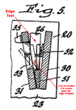 The Coin Chutes on a Wurlitzer Model 850 Jukebox Patent No. 2,304,240 If the coin cannot pass the edge template, it is ejected Click to Enlarge Click here if you want to learn how to get Patent Drawings In accordance with government specifications, genuine coins have peripheral edges which are slightly rounded and of a uniform curvature. On the other hand, the edges of counterfeit coins do not share this property since they are most often produced by stamping or punching operations that are much less precise than those used by the US Mint. The punching process leaves at least one sharp edge. The unique edge of genuine coins makes it possible to create a metal template that will pass only coins made to federal specifications. While it is possible for a counterfeiter to duplicate this edge, the time and effort required would make the actual cost of a counterfeit quarter much more than twenty five cents. A series of baffles prevent the coin from moving up the chute to prevent someone from soldering a wire to the coin to pull it back out after it has done its job. The coin is passed through the edge template by force of gravity, so this mechanism has no moving parts. This mechanism will err in the case of dented or bent coins, but will always return them to the customer. How would someone make counterfeit coins at home? During the 1930s, it was possible to obtain a wide variety of metal discs at almost no cost -- electrical junction boxes have "knockout panels" that are almost the size of a quarter. All radios were assembled on a metal chassis that held the sockets for the tubes. For less than a dollar (then), it was possible to buy a "chassis punch" that would yield a perfectly round piece of metal. "Tool and Die maker" was a recognized occupation and the skills needed to fashion a die with the rough outlines of a coin were fairly widespread.