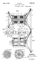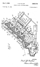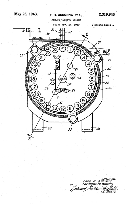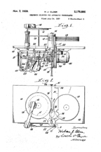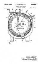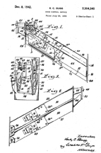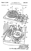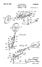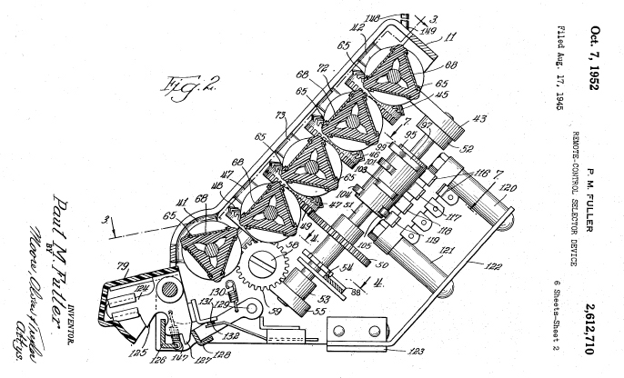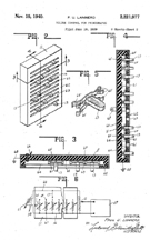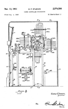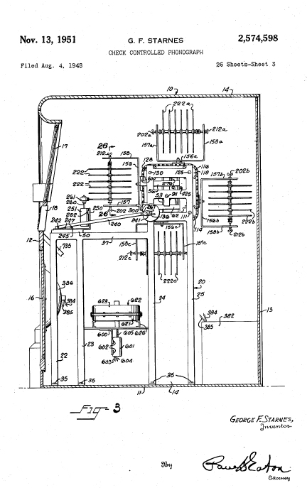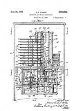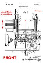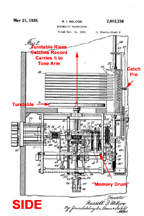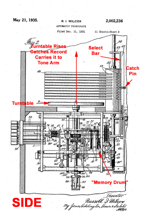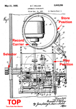 Typical Jukebox Playback Mechanism Patent No. 2,002,236 Demonstrator's Skeleton Model of the Simplex Mechanism Click to Enlarge Click here if you want to learn how to get Patent Drawings Briefly, records are held in chrome metal rings called carriers which are arranged in a stack. The carriers are mounted loosely on a vertical shaft. A Select Bar is raised along the hub of the carriers with a Catch Pin near the top. When the bar is raised to a predetermined level, the catch pin engages the carrier and rotates it from the store position to the play position. After the carrier is positioned correctly, the turntable rises, collects the record and raises it to the tone arm. The record is played, and at the end a series of levers and switches lower the turntable. The record is caught by the carrier and returned to the stack. The cycle is repeated until no more records are selected. Anyone who has seen an automatic record player manipulate a stack of records should be able to get a rough picture of how this works. Of course, there are many of you who have never seen a record changer, so you'll have to watch the video The only thing that is mysterious here is that which guides the "select bar" -- how does it know which disc to select and how does it know when to shut the machine off? That is covered below in the section on "Selection." While we are looking at Playback, it's possible to see some of the constraints imposed by such a system. First, the stack of records gets bigger as you offer more selections. The original machines offered 12 selections and this increased to 24. The carrier bars take up about half an inch of vertical space, so 12 records would take up 6 inches and 24 records would take up about a foot. Note that the mechanism shown in the video allows the record to come out of the carrier when pushed upward by the turntable, but the record cannot move through the bottom of the carrier. (The Wilcox system can only play one side of the record.) In addition to the vertical distance for the stack of carriers, there must be an equal room below the play deck to accommodate the shaft that raises and lowers the turntable. Thus, a 24 selection Wilcox machine requires at least two feet of cabinet space just for playback. Highly innovative schemes were devised to increase the number of selections -- below, you'll see a patent for a gadget that turns the record over, allowing a machine to offer both sides, effectively doubling the number of selections. The ultimate expression of the Wilcox mechanism had 32 carriers and two-sided play for a grand total of 64 selections. Next, you'll see a scheme that had four separate Wilcox machines available, and a chain drive was used to position the correct "stack". Finally, you'll see a patent for the ultimate evolution of playback in which a horizontal donut-shaped layout was used. This enabled jukeboxes to play up to 200 selections. Needless to say, a box using the donut configuration had to be fairly wide at the top.
