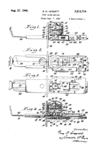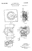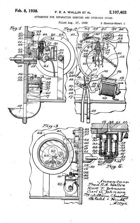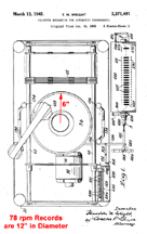 Counterfeiters tools lying around the house in the 1930s Access to discs of metal was widespread Click to Enlarge Thus, it was fairly easy to create slugs or counterfeit coins. An enterprising fellow might knock off enough slugs in an evening to provide dancing, chewing gum and cigarettes for a month. Using slugs is like trying to break a password -- since the counterfeit is simply rejected, the thief gets to "try" as often as he wishes with no penalty. Here is a patent (developed by the Seeburg Company) that was the death-knell to home counterfeiters. Coin Checking via the Thermocouple Principle Patent No. 2,107,402 Click to Enlarge Click here if you want to learn how to get Patent Drawings The authors state: "...he United States nickel in contact with most other metals constitutes a thermocouple which gives a higher thermoelectric current than does any other common metal, including the metals and alloys of which slugs and tokens are usually made, silver coins, and even coins of pure nickel, such as the Canadian nickel. A coin of pure nickel, such as the Canadian nickel, gives a lesser thermoelectric effect, which is, however, much greater than that of the other metals and alloys mentioned. Our apparatus can be adjusted in sensitivity so that it will accept only United States nickels or accept both United States and Canadian nickels..." The brilliant minds at the vending machine companies were often only one step ahead of the cheats. Playback MechanismsThis section is just a bit out of place, because the machine cannot play a record until it has been selected. We're going to ask you to bear with us because the selection mechanism only makes sense if you understand playback. There are numerous variants on playback technology, probably beginning with the Seeburg Audiphone. On this early machine, each record was affixed to its own platter, and these were arranged at the circumference of a large wheel. Since 78 rpm records are 12 inches in diameter, 10 records would require a wheel about 40 inches in diameter, while 12 records would have required a four foot diameter wheel. Of necessity, the Audiphone was almost square!