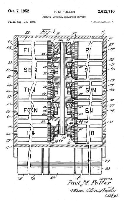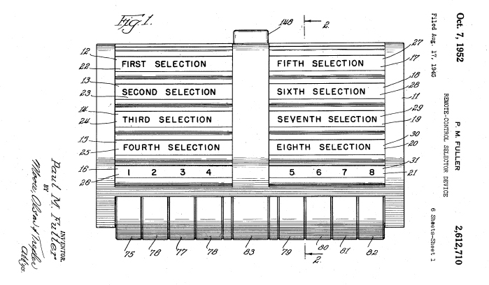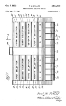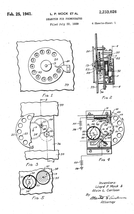 Jukebox Selection Displays During the 1930s Early Jukebox Dial Selector Patent No. 2,233,026 Wurlitzer Simplex Multi-Selector Click to Enlarge Electromechanical Jukebox Selector Patent No. 2,319,945 Click here if you want to learn how to get Patent Drawings The actual method of making the connection between the customers and the cams went through an evolutionary process. First, the process was strictly mechanical using a device similar to a telephone dial. "Dialing" the selection moved the cam-setting lever down the stack to the appropriate slot; pressing the "select" button activated a lever that set the cam. However, this method had an ergonomic problem -- considering the width of the finger hole, the dial could only hold a small number of selections (12 was the practical limit). Next, in order to provide more selections, electromagnetic setting was used. In early models (e.g. the Wurlitzer "Simplex") a group of button switches were arranged in a circle (to provide visual continuity with the dial systems). Each button, however, operated an electrical switch that activated a solenoid that set the cam (one solenoid per wheel). Once the switch/solenoid system was in place, the selection mechanism evolved to a keyboard that is still used today.
